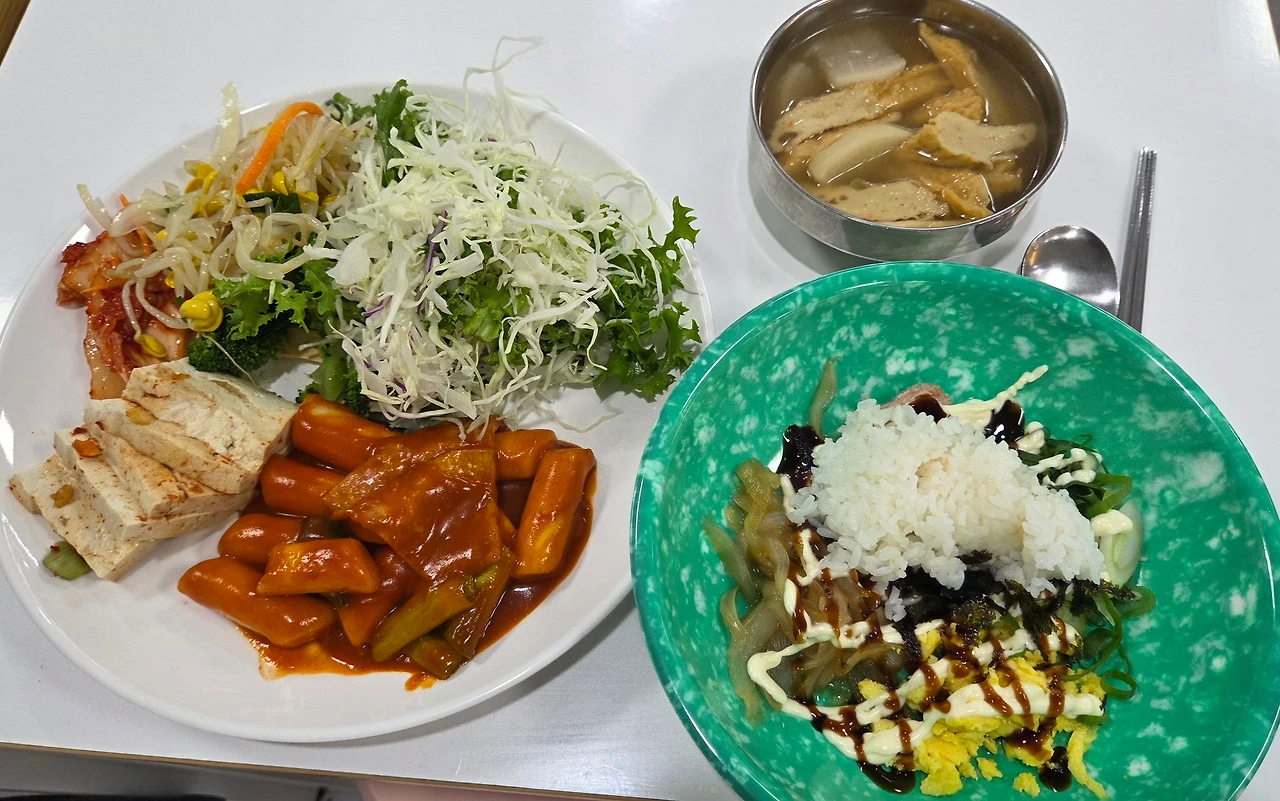참치마요, 어묵탕, 브로콜리와 초장, 온두부와 간장, 김치, 샐러드, 떡볶이...