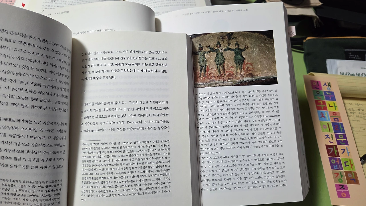 슬슬 책을 넘기면서 도판을 본다. 눈이 머물거나 관심 가는 도판이 있으면 설명을 읽어본다. 주의를 끈다면 그 도판에 대한 부분을 설명한 책의 본문을 읽어본다. 옆에 두고 자주자주 펴본다. 두껍지만 편집이 좋다. 도판이 많고, 설명옆에 딱 붙인 도판으로 편집되어 있어, 뒤로 갔다가 앞의 본문을 읽는 수고가 없다. 그냥 읽으며 그림 보며 빠져들 수 있다. 챕터마다 분량이 많지 않은 것도 부담적은 일이다.