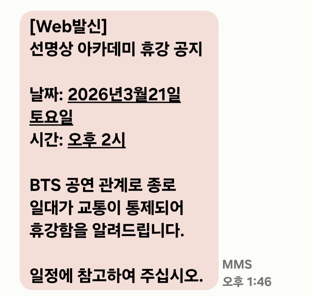 이번 주는 BTS 공연으로 종로 일대 교통통제라며 휴강을 한다.