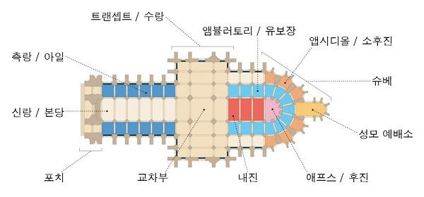 -주보랑(周步廊, Ambulatory)- 교회(성당) 건축에서 측랑이 내진부로 연장되어 생긴, 내진과 후진을 감싸는 회랑이다.