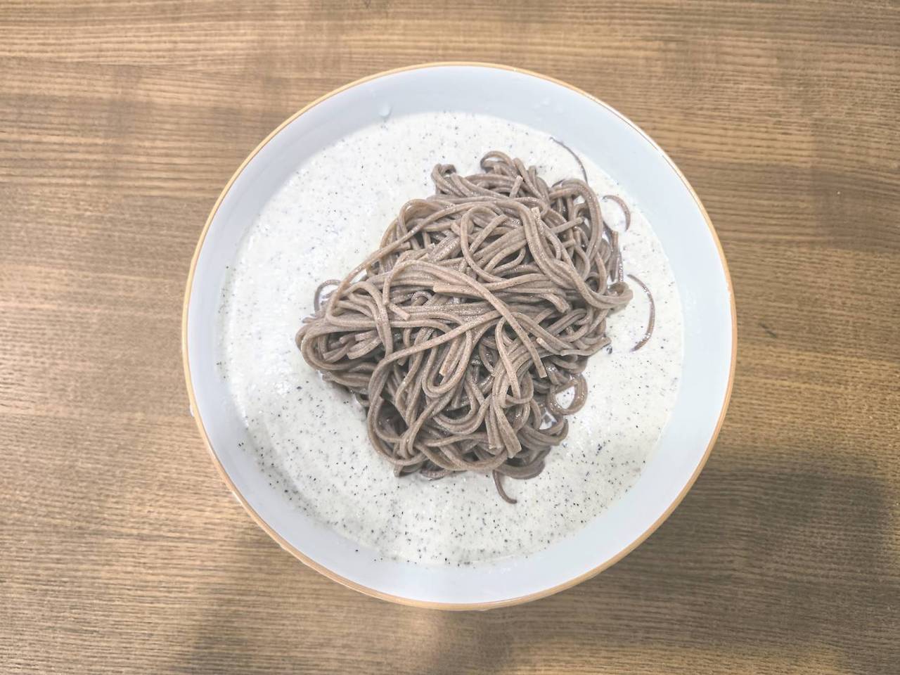 재료를 믹서기에 갈고 면을 삶으면 끝이다.(호박씨는 굳이 넣지 않아도 됨. 냉장고 안에 있어서 사용한 것임.) 이 재료라면 건강면에서도 손색이 없다.