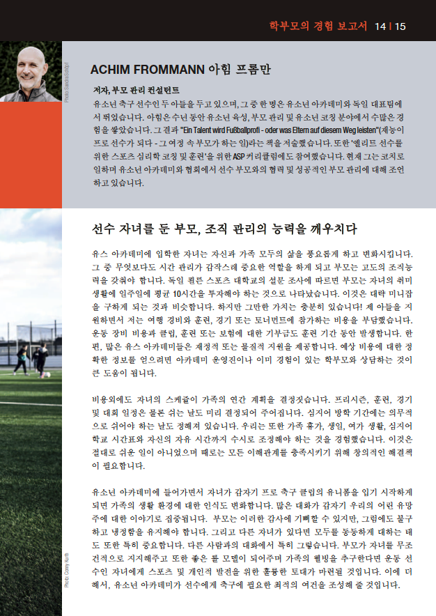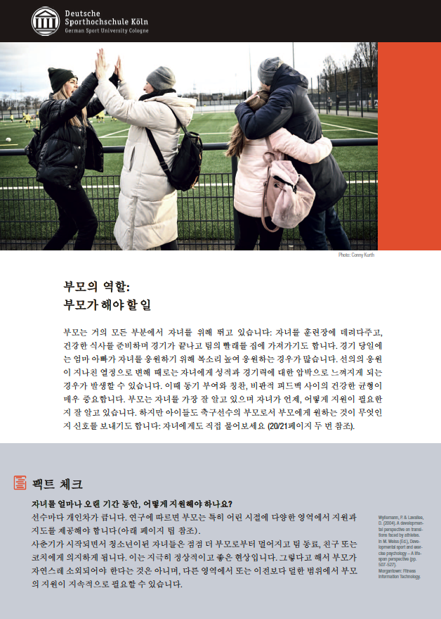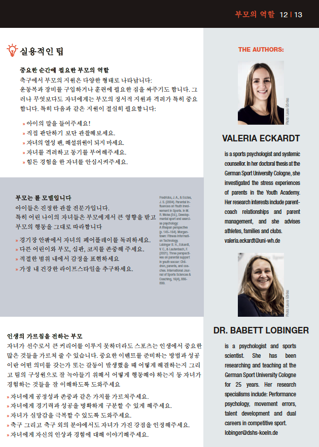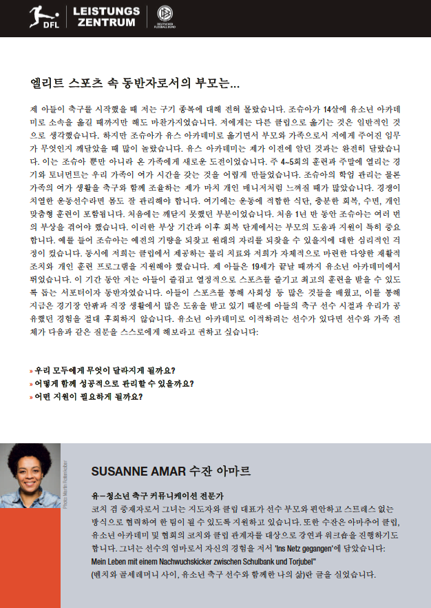 2024년 1월 25일, 독일 프로축구 연맹(DFL)과 독일 축구 협회(DFB)가 협업하여 프로 산하 유스 클럽 선수 자녀를 둔 학부모를 위한 브로슈어를 만들었습니다. 유소년 선수 자녀를 둔 학부모를 위한 지침서로 도움이 될 수 있기를 바라며 한국어로 옮겼습니다.