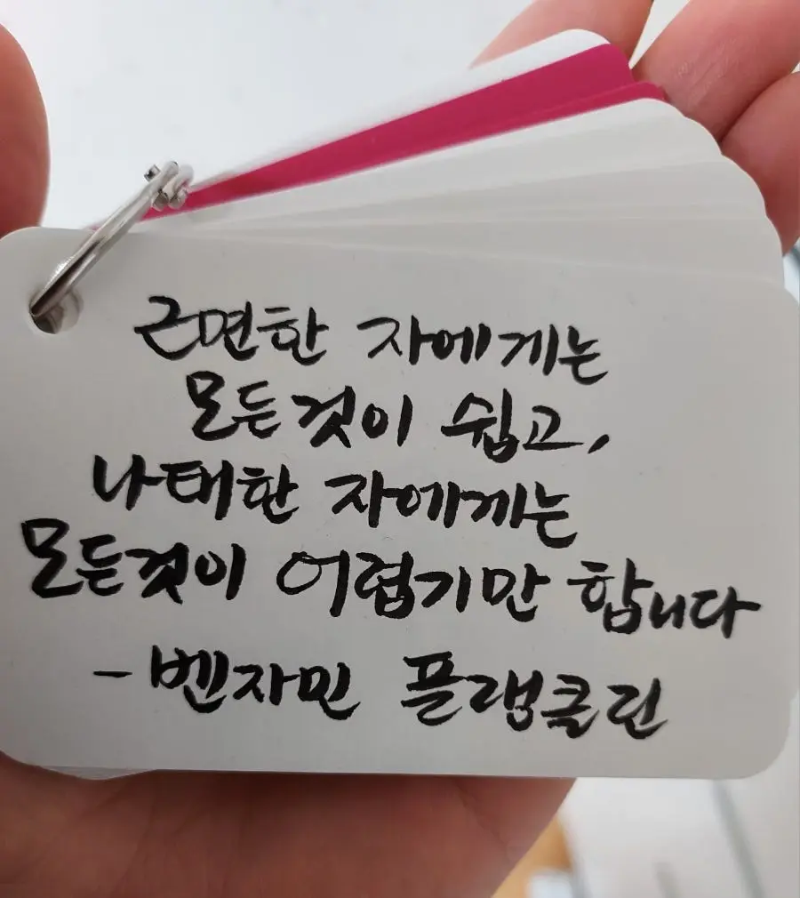 어젯밤, 나 자신에게 경종을 울리기 위해 필사를 했다. 아침에 일어나 보니 플랭클린 이름에서 플, '플'자에 획 하나를 빠트린 걸 발견하고 웃는다.