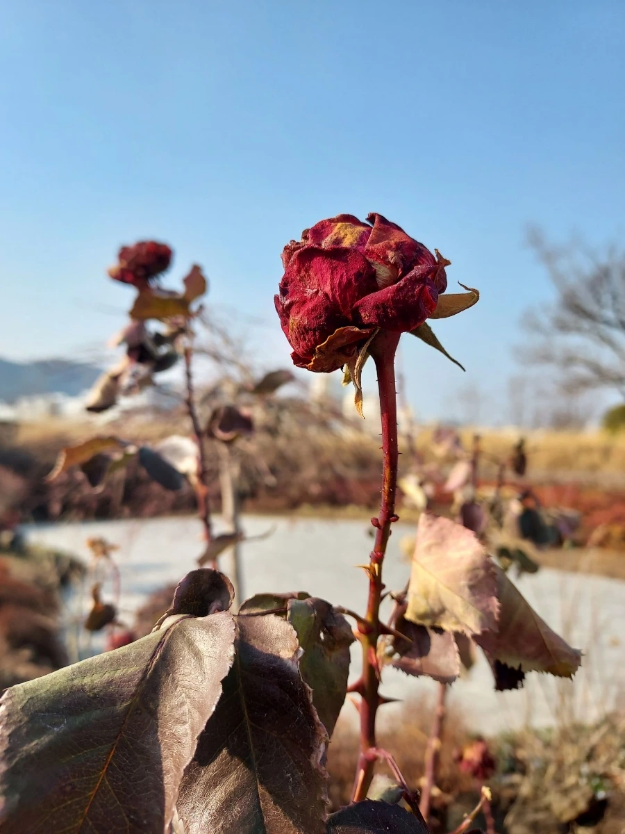 피지도 못한 메마른 꽃 한 송이에 눈물 떨구고