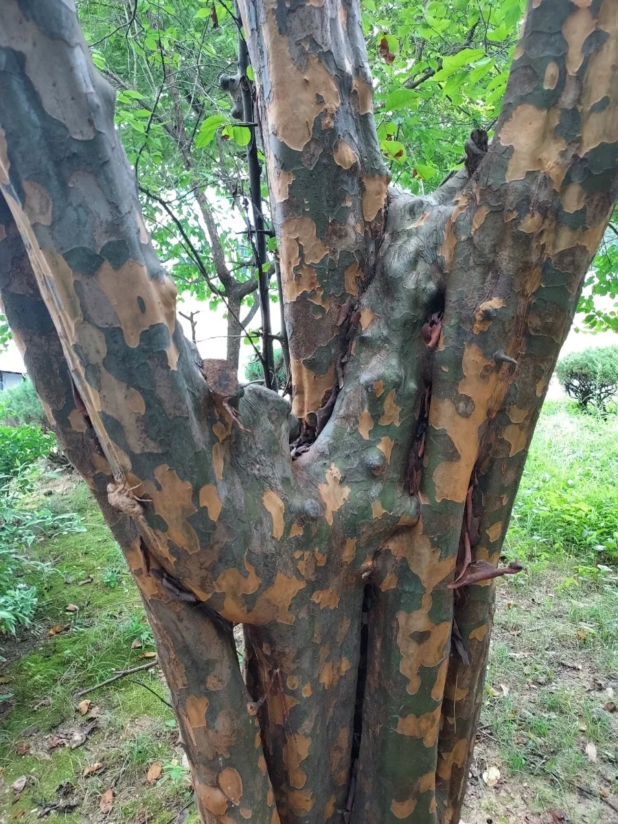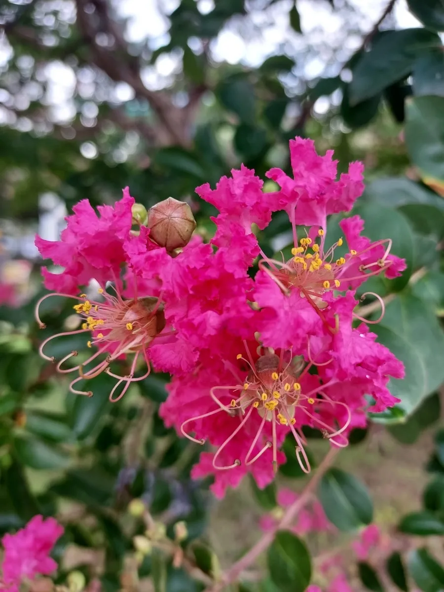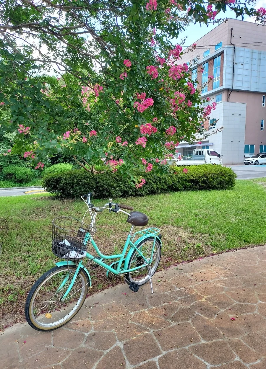 민트색 자전거와 다홍색 배롱나무꽃이 찰떡이다.