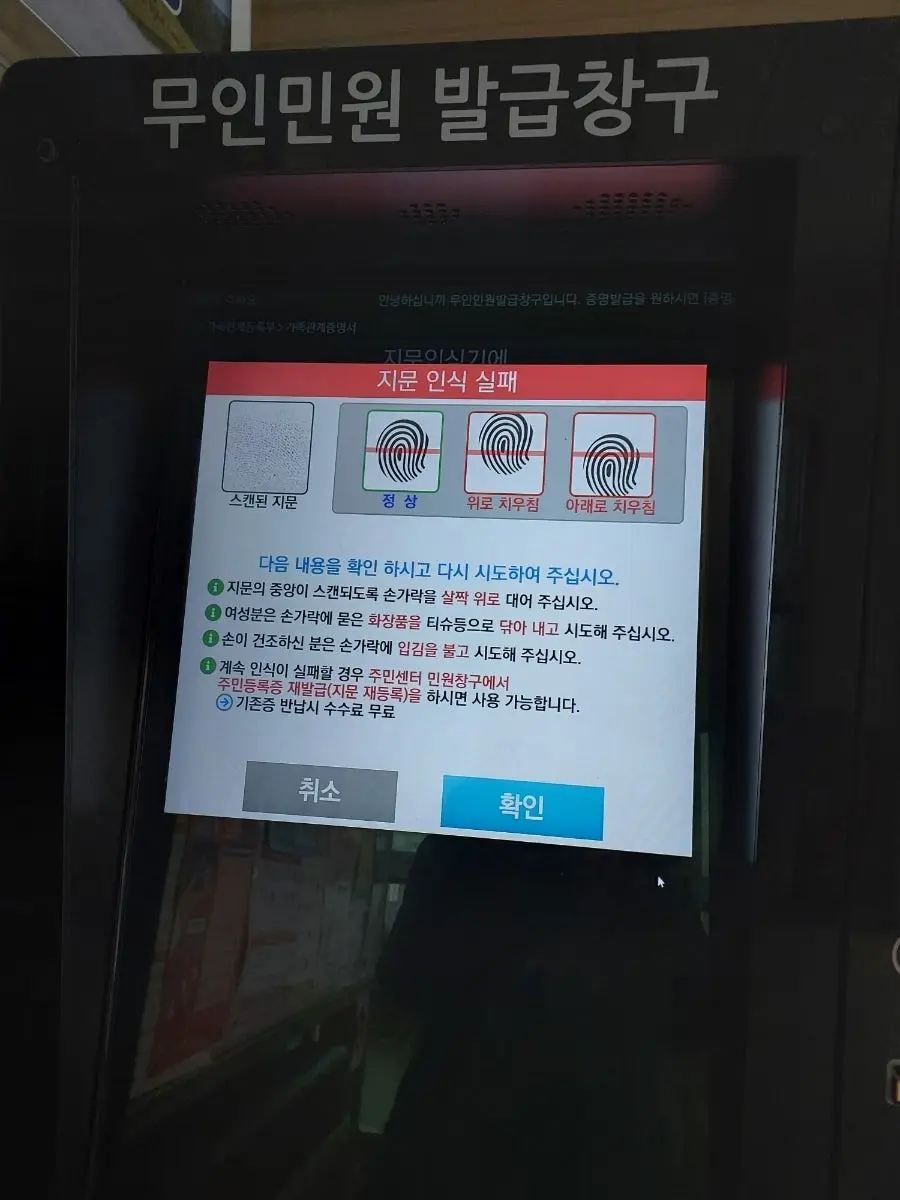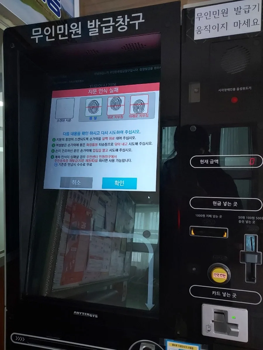 이런, 무인발급기가 내 지문을 인식 못하네.