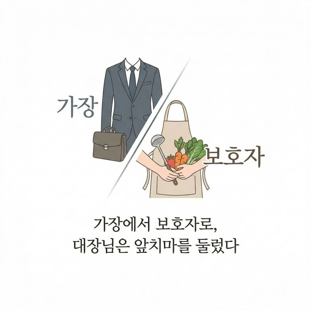 그날 이후 아버지는 평생 해본 적 없는 주방일과 집안 살림을 시작했다. 처음에는 정말 답답했다. 하나부터 열까지 알려드려야 했는데 그 '하나'부터도 처음 아이가 언어를 배우듯 설명해야 했다. 1960년대 대한민국 경제성장의 한복판에서 자기 취향조차 모른 채 묵묵히 일을 해온 경상도 사나이. 그에게 앞치마와 국자가 들렸다. 가장에서 보호자로, 그리고 주부로.