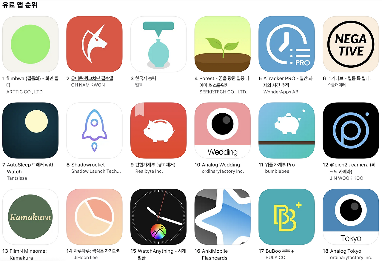 이 중에 내가 실제로 돈을 지불하고 다운로드한 앱도 몇 개 보였다. (필름화, 아날로그 시리즈, 하루하루 등)