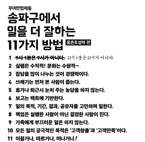 둘째, 서로를 격려하는 분위기가 형성되면 팀의 퍼포먼스가 향상된다. 이 의견에 대해서는 갑론을박이 있을 것 같기도 하다. 혹자는 일터는 놀이터가 아니기 때문에 경직된 분위기를 형성해야지만 구성원들이 규칙과 예의를 지킬 것이라고 한다. 필자도 사소한 실수로 큰 손실이 발생할 수 있는 의료계나 군사계에서는 격려와 칭찬을 경계해야 한다는 의견이 타당하다고 생각한다. 하지만 우리는 기술과 문화 혁신의 최전선에서 창의력으로 승부하는 IT 프로덕트 메이커 아닌가. 우아한형제들이 제시하는 '송파구에서 일을 더 잘하는 11가지 방법'을 보면 배민 사내에서도 수평적 문화를 통해 일명 '꼽'을 주는 행위는 기피할 것을 권유한다. 창의력으로 승부 보겠다는 사람들이 의견 공유에 제한을 두고 동료의 의견에 소극적인 반응을 보이는 것은 무조건 기피해야 할 일이다. 틀을 깨는 아이디어는 수평적인 분위기 속에서 동료와의 잡담 중 편견과 선입견의 궤도를 벗어나는 순간에 탄생한다.