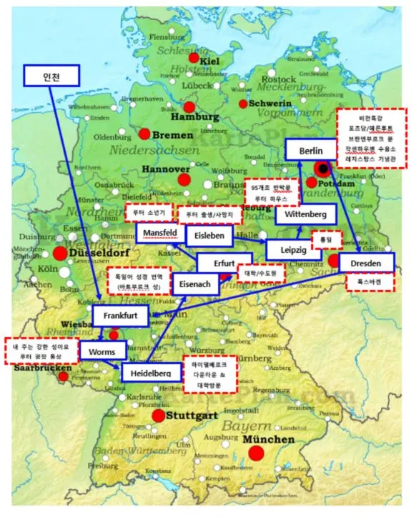 2주 동안 마틴 루터의 도시들과 통일, 역사 및 인문학과 연계된 총 12개 도시들(아래 사진과 같이 11개 도시를 계획했으나 실제로 12개 도시를 다녀왔다)을 답사하고 느끼고 배운 것을 이곳에 기록한다. 본래 종교개혁과 통일이라는 큰 두 가지 테마를 잡고 갔었는데, 다니면서 생각하지도 않았던 음악, 건축과 디자인, 문학, 역사 등의 추가적인 경험을 얻게 되었다. 얻은 모든 것을 나누려고 한다.
