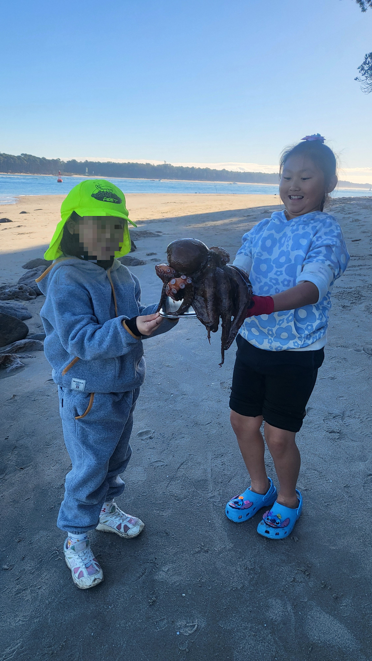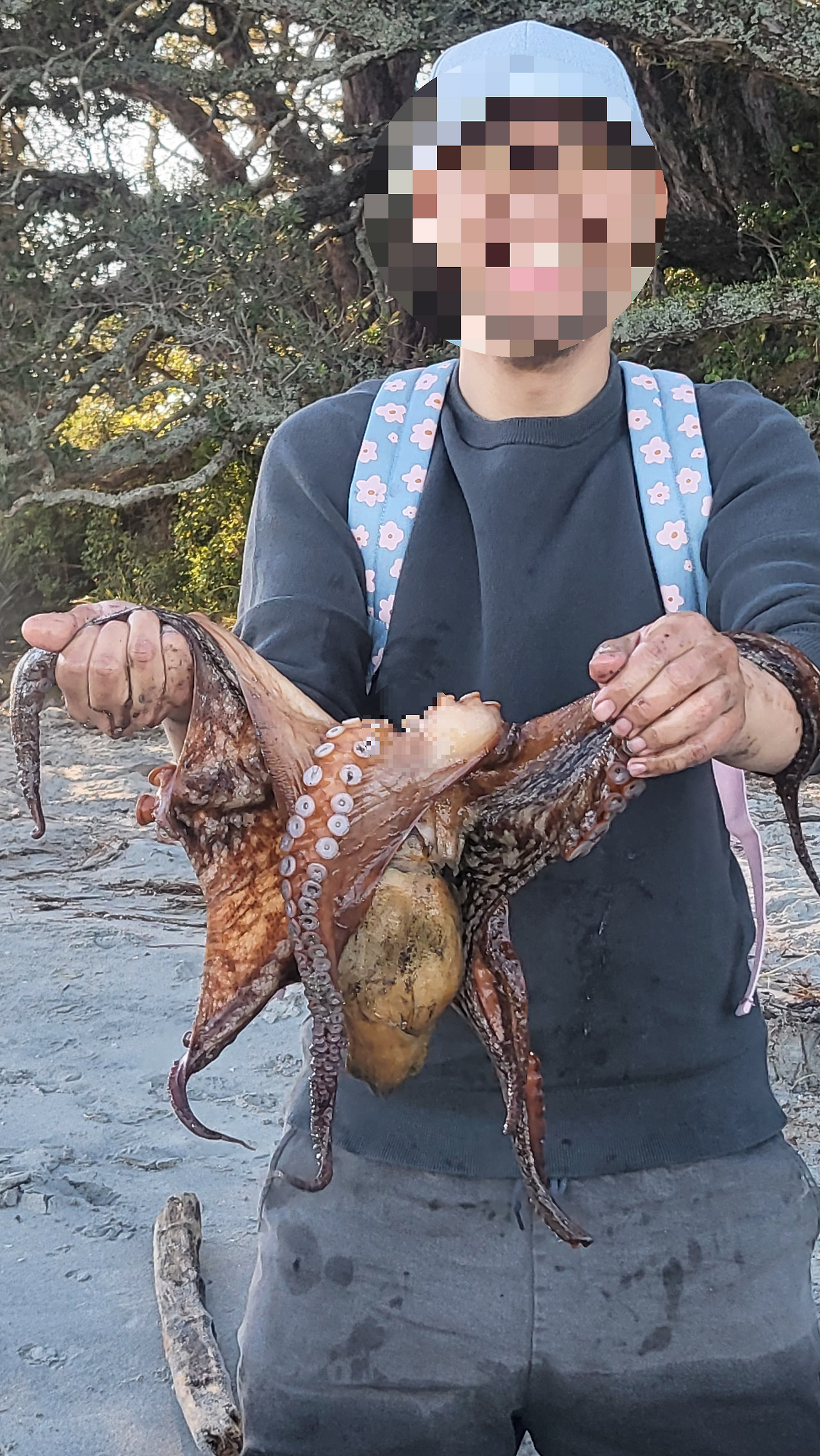 나는 해루질을 하러 가기 전에 항상 구글에서 Low tide를 확인한다. 시간대별로 바닷물의 높이가 자세히 나와 있으니 체크를 하고 가면 허탕 치는 경우가 작다. 바다에 갈 때 필요한 도구들이 있다. 나는 반드시 집게와 뜰채, 잡은 생물을 들고 올 수 있는 뚜껑 달린 큰 통, 장갑을 챙겨 간다. 뉴질랜드의 바닷속에는 한국인이 좋아할 해산물들이 많이 있다. 논현동에 가끔 가던 해산물집이 있었다. 가난했던 20대는 오징어회를 주로 먹어야 했지만 말이다. 어쩌다 한 번씩 먹어봤던 해삼, 성게가 뉴질랜드 집 근처 바다에 살고 있다. 문어도 산다. 문어의 반질 반질한 민머리가 보인다. 문어를 발견하면 그 즉시 맨 손으로 미역줄기 잡아 뜯듯이 잡아 건져 올리면 된다.