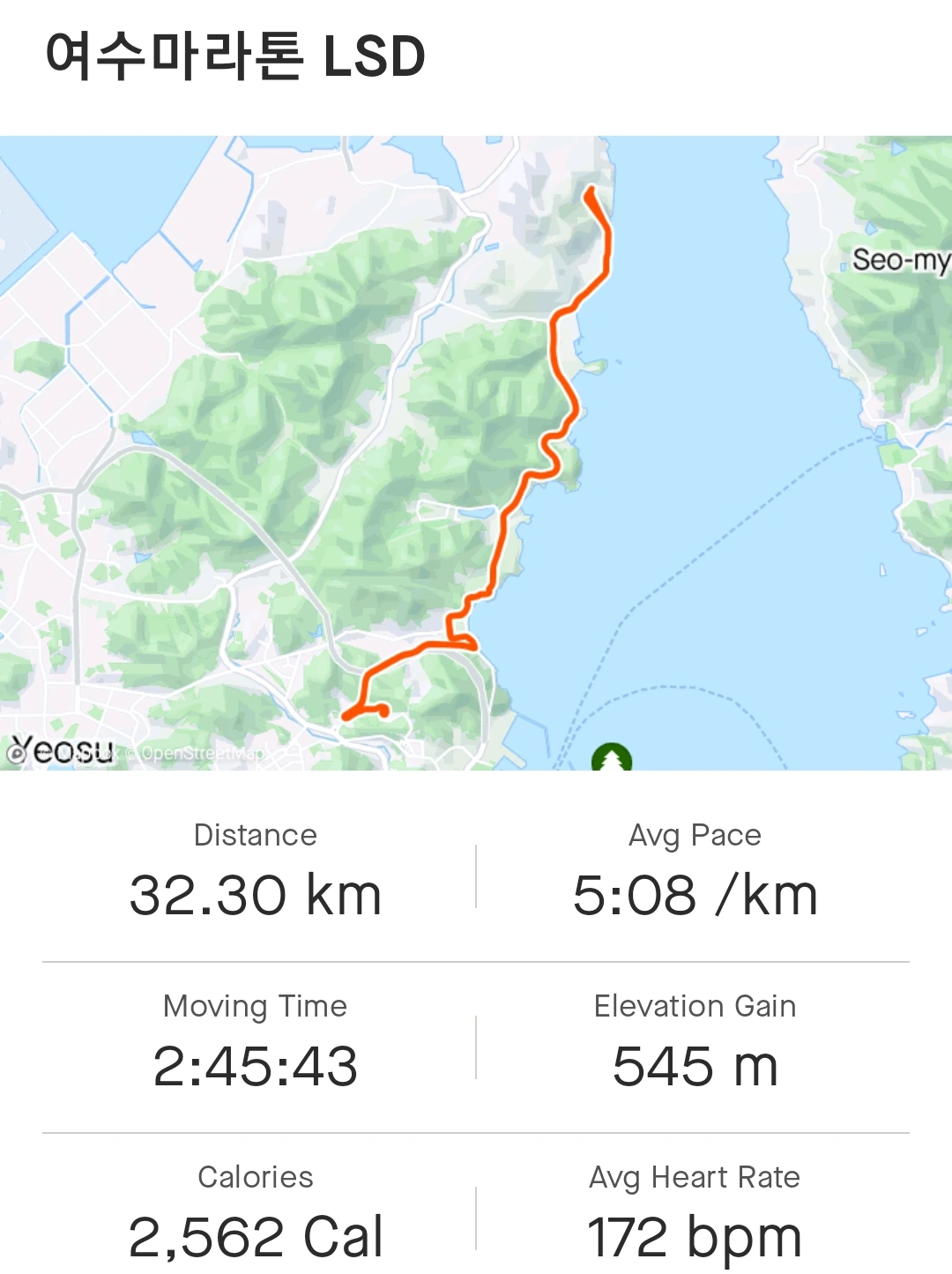 올해 3월에 열리는 동아마라톤을 대비하여우리나라 3대 난코스로 소문난 여수마라톤을 신청하였다. 풀코스 1차 반환을 다녀오면 32km가량으로 언덕훈련과 함께 장거리 LSD가 될 수 있을 것 같다는 생각이 들었다. 시작 전, 많은 지인들은 "그거 뛸 거면 풀 뛰는 게 어때?"라고 했지만 ESTJ인 나는 계획대로 진행하였다.
