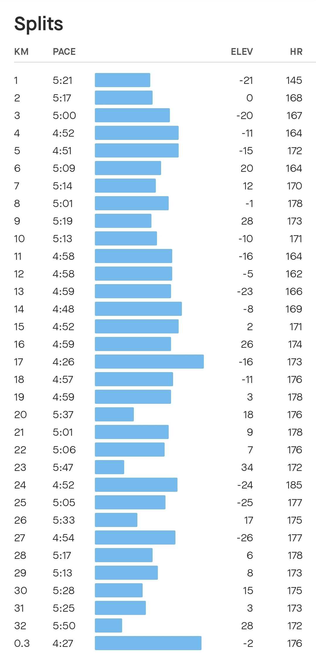 나는 풀코스가 아닌 32km만 뛰었기에, 2시간 45분 만에 결승선을 통과하였다. 마라톤 풀코스를 뜻하는 빨간색 배번을 달고 뛰어오니, 오해한 5km, 10km, 하프코스 참가자들이 존경의 눈빛으로 날 바로 본다.