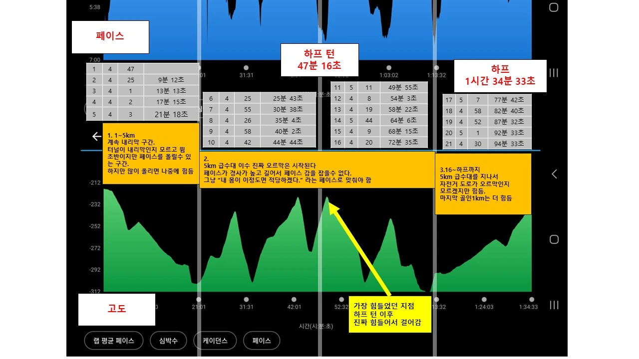 클럽 훈부님께서 보내주신 전략은 작년에 하프를 뛰었던 곳으로, 크게 도움은 되지 않았다. 다만 23년도의 느낌을 살려 업힐과 다운힐 그리고 평지에서 어느 정도 속도에 달려야 할지, 마음속으로 시뮬레이션해보았다.