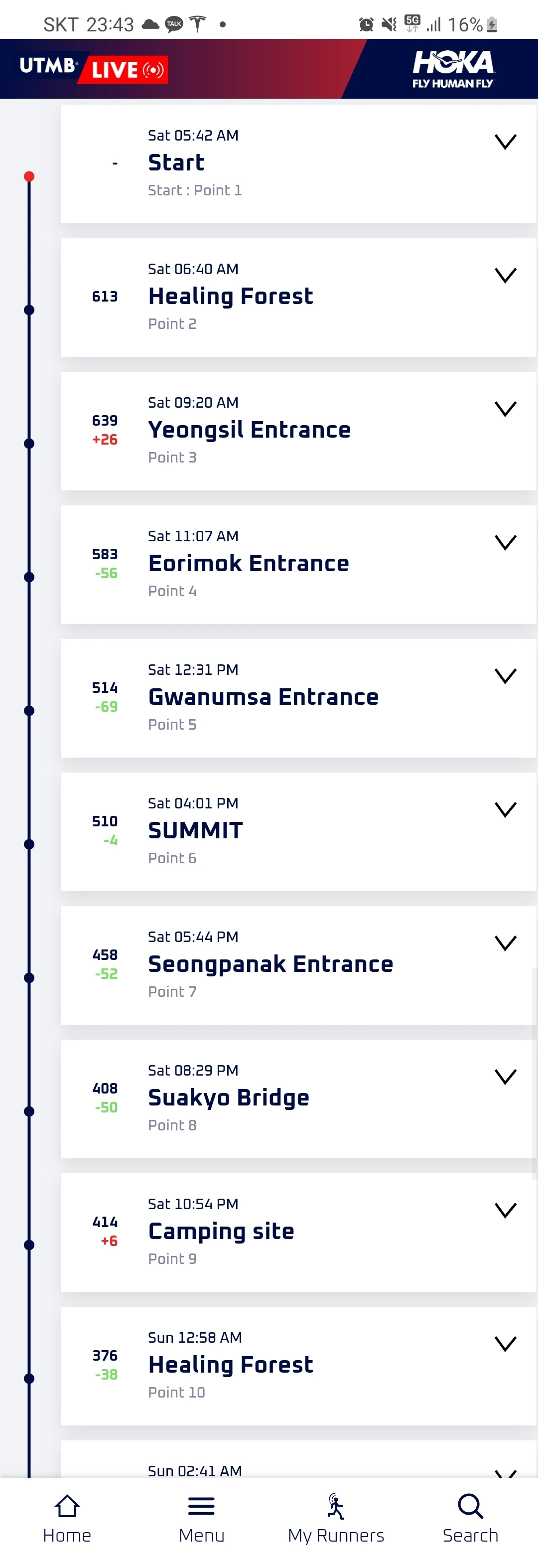 야영장 CP에서 튀김우동을 먹으며 기다리는데 DNF를 한다는 주자들이 속출하였다. 그간 90km를 달리며 몸이 고장 난 사람이 한둘이 아니었다. 나는 생존이 걸려있어 죄송하지만
