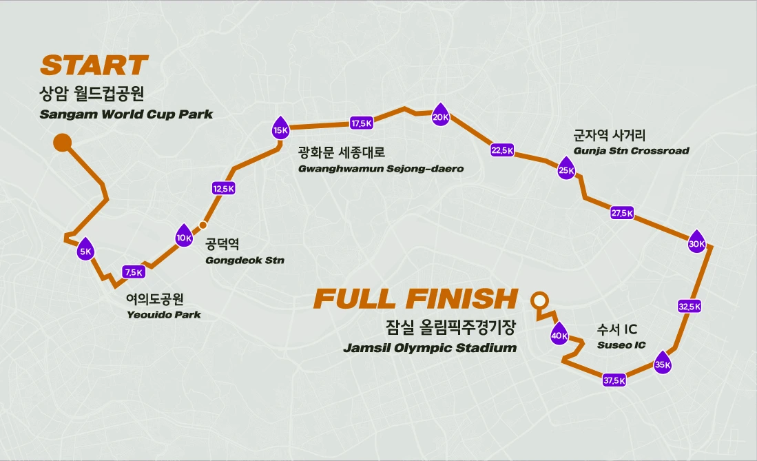 동마 때 기록이 3시간 57분으로 이번 대회는 B조로 배정받았다. 18호차에 짐을 맡기고 출발선으로 이동하였다. 이동을 해보니 10k 주자들이 엄청 많았다. 코스모스 밭에 주황색 꽃만 심은 것처럼 물결을 이룬 모습은 브라질의 이과수 폭포처럼 실로 웅장함이 느껴졌다. 추적추적 내리던 비는 어느 순간 멈췄고 마라톤경기에 좋은 환경이 만들어졌다. 주로를 뺑글뺑글 돌다 보니, 출발시간이 다가왔고 움직이지 못할 정도로 인파들로 둘러 쌓여 더 이상, 몸을 풀지 못했다. 드릴운동으로 골반을 더 풀어줘야 했는데, 아쉬움이 컸다. 내가 1년에 두 번 메이저대회를 나가는 것은 내가 좋아하는 사람들과 같이 서울의 거리를 달릴 수 있는 것은 행복이라고 생각하기 때문이다. 지금까지 수많은 운동을 해봤지만 거의 대부분을 상대를 꺾어야만 승리의 기쁨을 쟁취할 수 있는 운동이어서 욕이 난무하고, 불공정한 반칙들이 많았지만 생전 처음 보는 이에게 응원을 받을 수 있는 메이저 대회를 손꼽아 기다리는 이유이기도 하다.