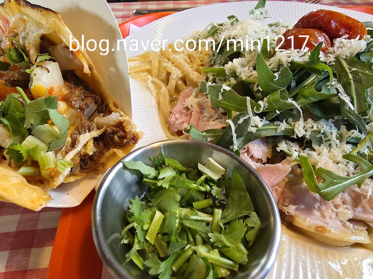 타코 위에 고수를 듬뿍 올리고 한입 베어 물어보니 고기의 육즙이 정말 좋다.