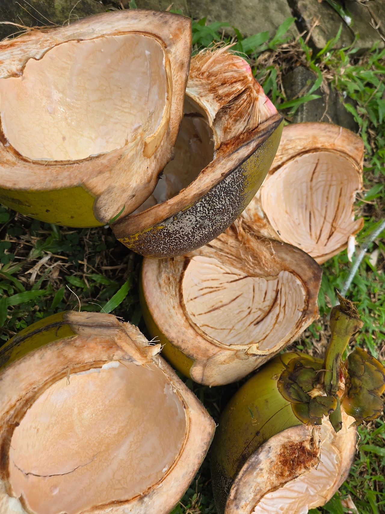 어라 이게 뭐냐 코코넛이다 단단한 코코넛 껍질은 무거운 칼로 성장한 남자가 내리쳐 힘겹게 위에 구멍이 나도록 자르고 넓은 볼에 물은 붓고 또 반으로 자른다 속에 있는 하얀