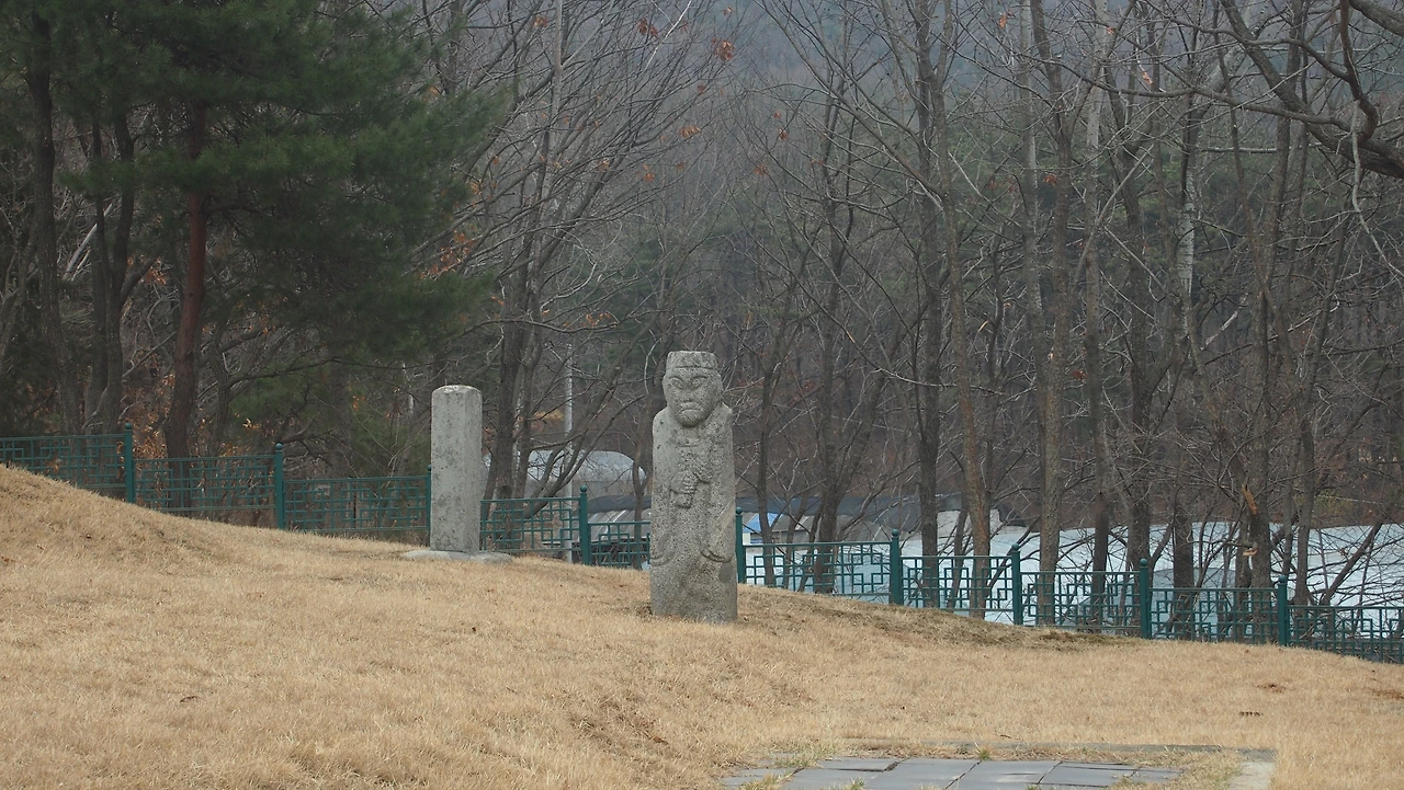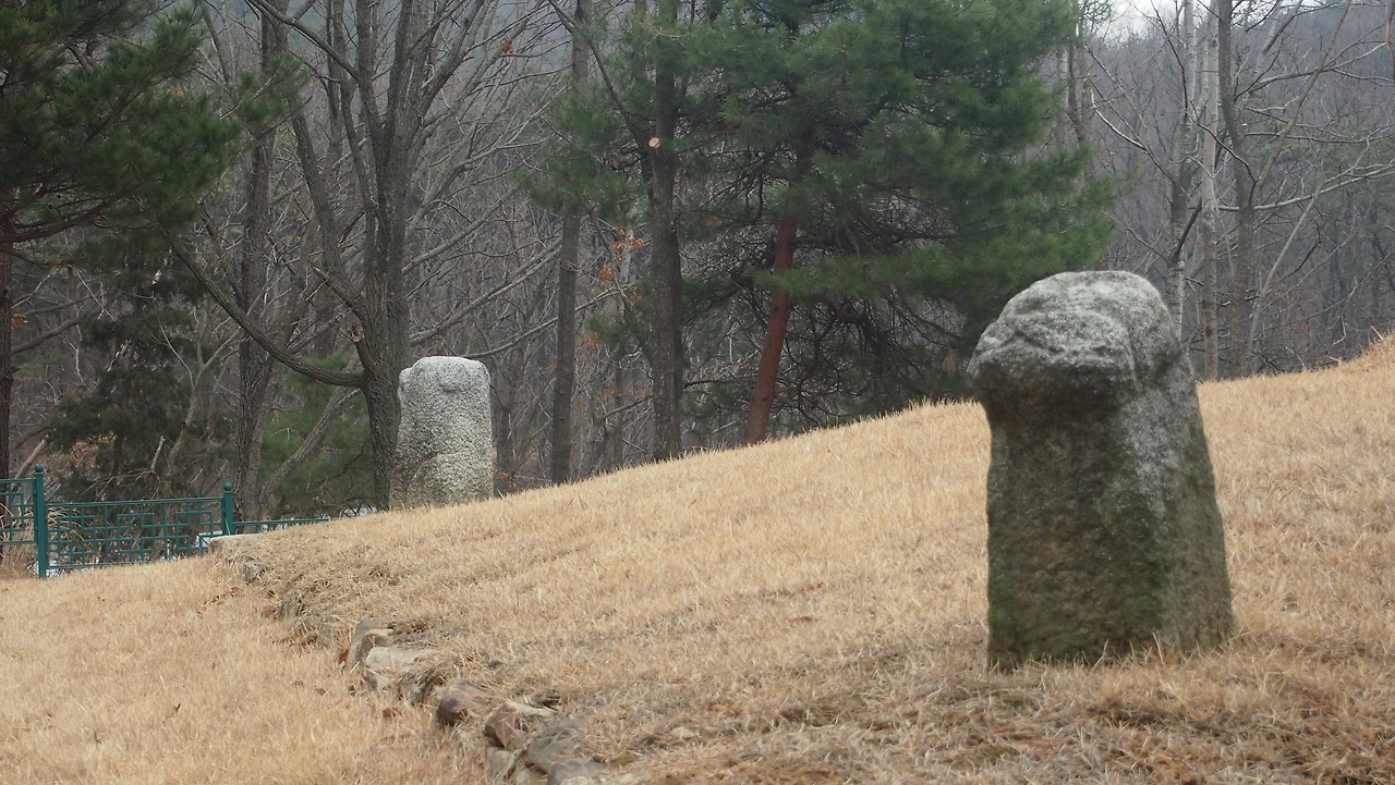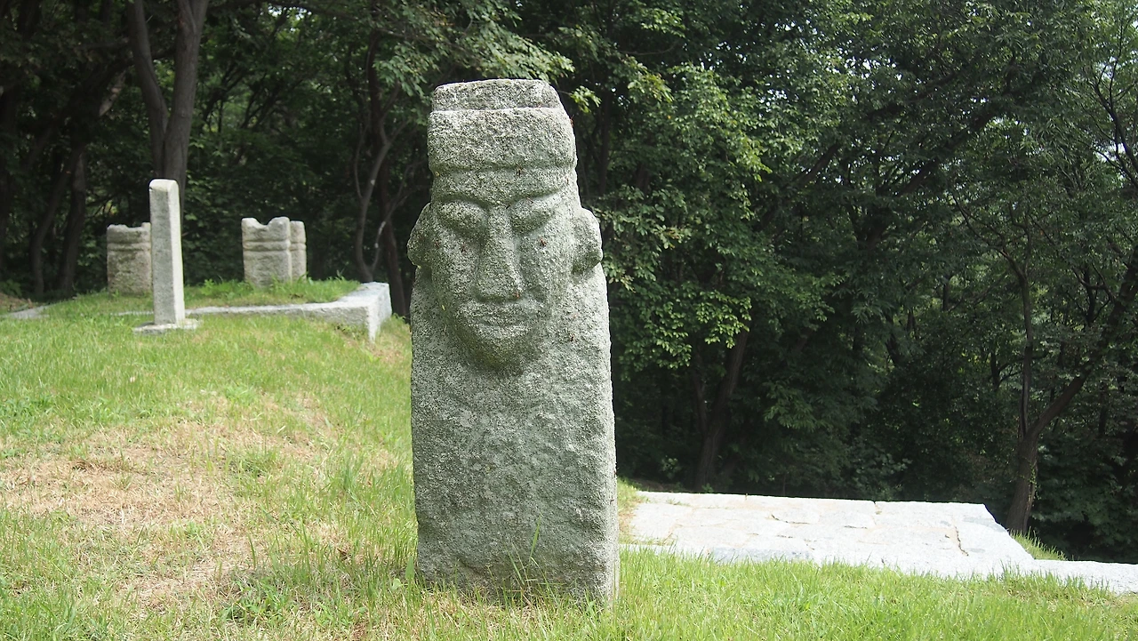 이밖에 우리가 왕릉을 보면서 대개 감상하는 것이 여러 가지의 석물(石物)인다. 먼저 문인석을 보면 무뚝뚝한 표정에 관모 및 관복을 착용하고 허리에 각대를 하였으며 홀(笏)1)을 양손에 들고 있는데 이러한 형식은 조선왕릉에서도 크게 바뀌지 않는 형식이다. 과장되도록 위로 치켜든 눈은 조선시대를 훌쩍 넘어선 해학적이고 고고한 맛을 느끼게 한다.