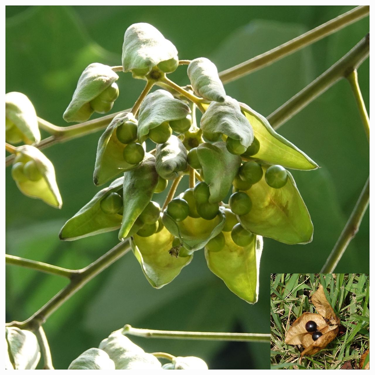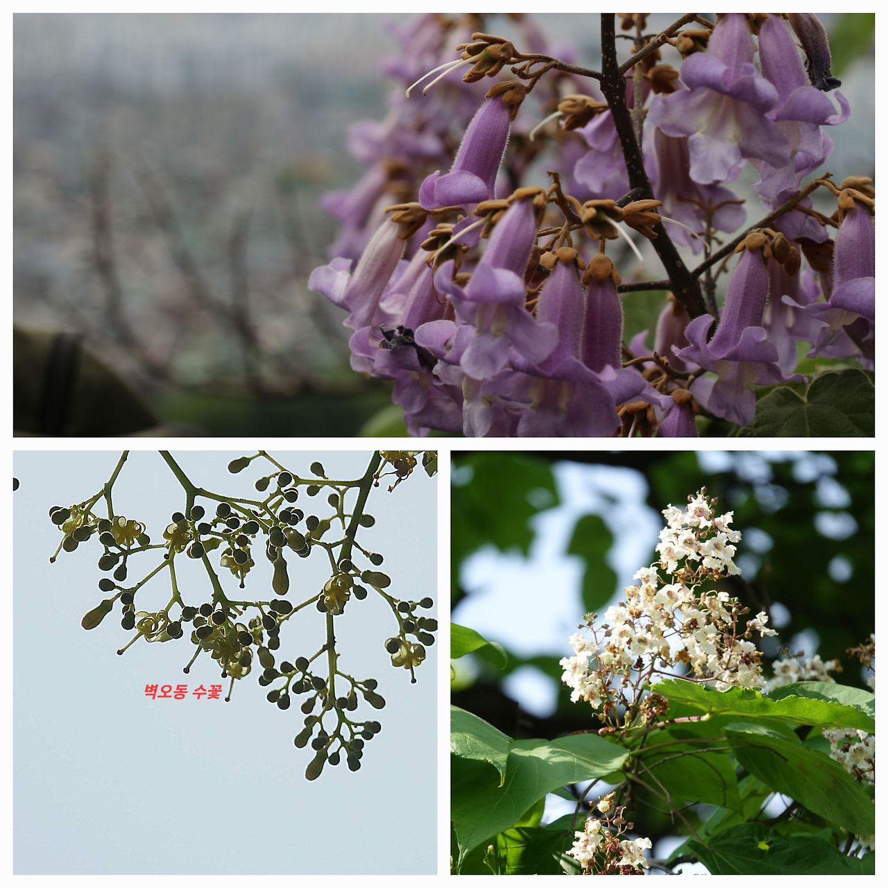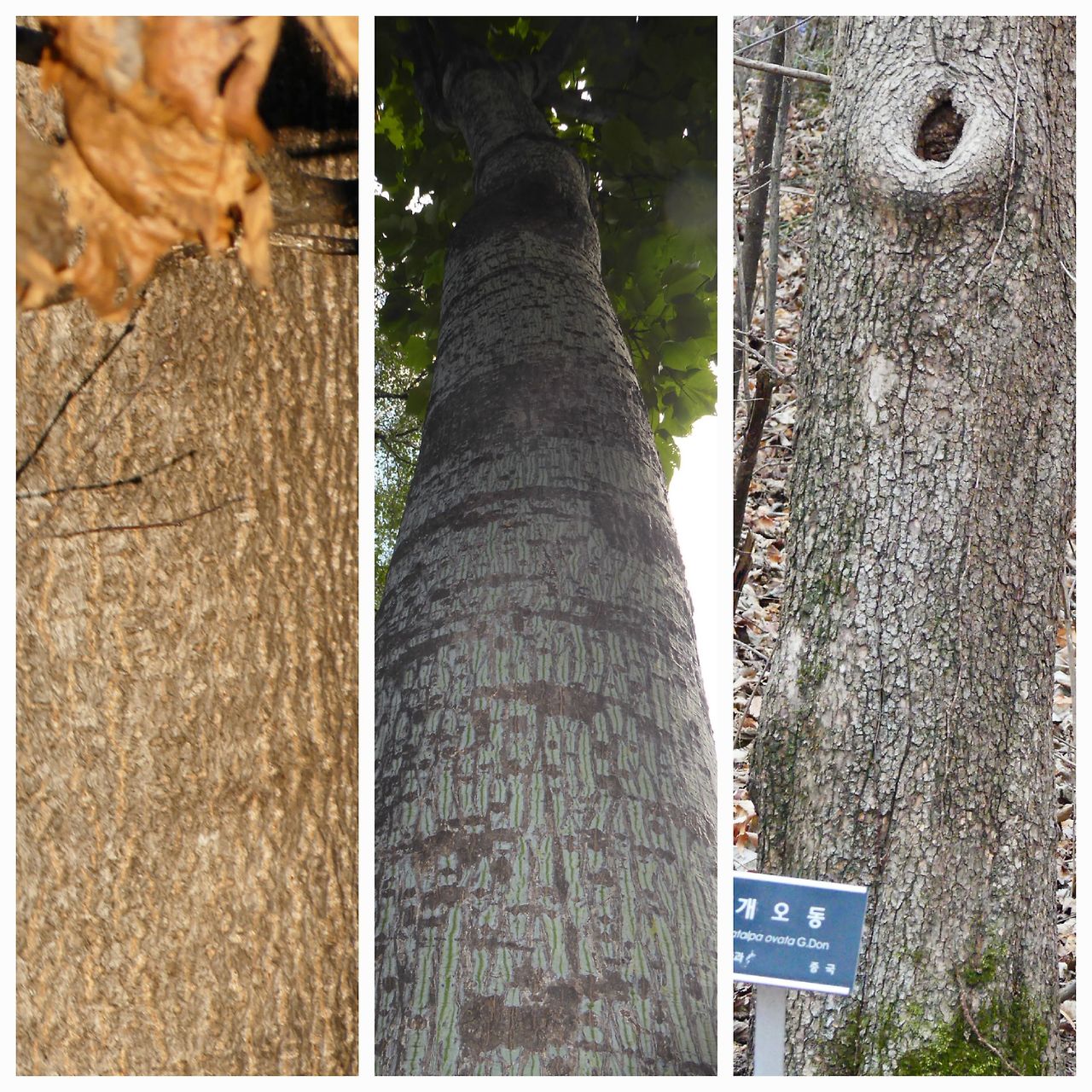 꼬투리가 익기 전에 벌어진 벽오동과 익은 후 벌어지는 모감주나무 꼬투리 비교(좌), 좌로부터 오동나무, 푸른색의 벽오동, 개오동의 수피(중), 시계방향 오동, 개오동,벽오동(우)