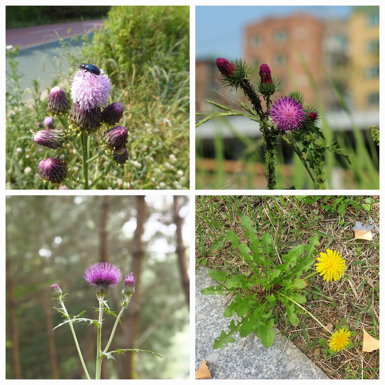 이때쯤이면 지칭개와 엉겅퀴도 빨강과 보랏빛으로 합세하여 각각 대지의 캔버스에 자리를 잡는다. 봄을 알리는 들판의 잡초라 이름들도 개똥이며 쇠똥이네 하듯이 대충대충 얽어서 지어 붙인듯한 이름들이다. 쓰다고 해서 씀바귀이고 쓴귀물, 싸랑부리, 쓴나물, 싸랭이라고도 불린다고하니 씀바귀로서는 성의 없이 막 던져진 이름을 몇 개씩이나 달고 있는 것이다.