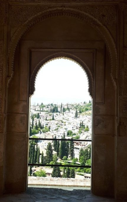 알함브라궁전의 아치(좌). 능소화의 아치형 수술. 가운데 직선으로 올라간 암술(중). 꽃잎 벽면에 붙은 수술이 보인다(우)