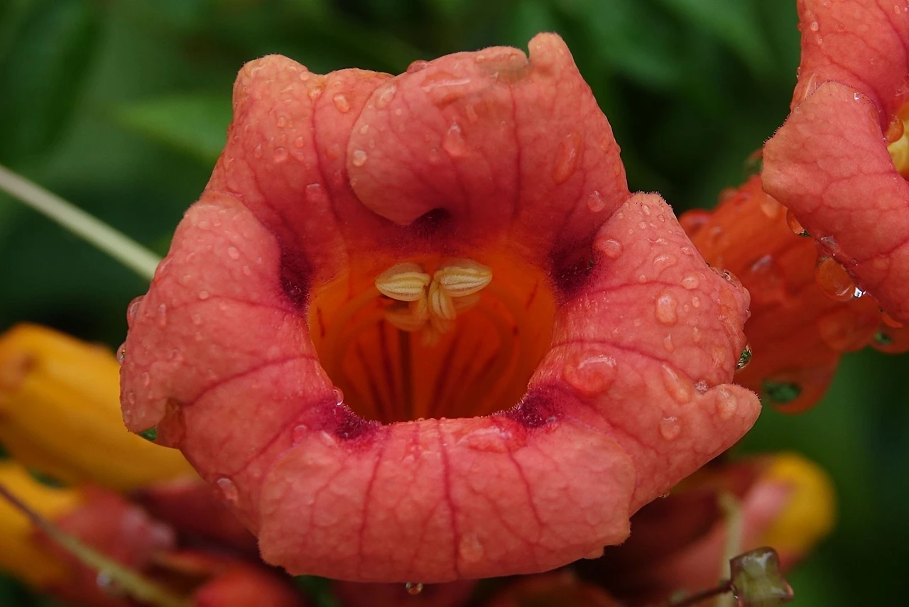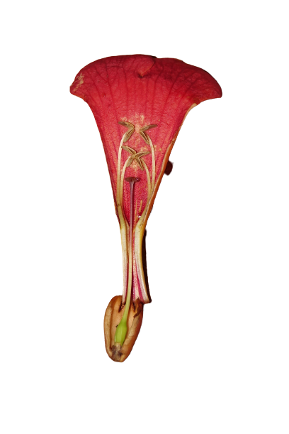 더욱 신기한 것은 여타의 식물에서는 좀처럼 볼 수 없는 암술과 수술이 꽃잎의 벽에 바싹 붙어있는 것이 아닌가. 왜 그럴까 ? 능소화는 벌새나 벌 종류에 의한 수분이 이루어지는 충매화다. 벌 등은 암술과 수술의 꽃이 중앙에 위치하는 것 보다 꽃잎에 붙어 있을 때 공간이 더 확보되므로 수분매개자로서의 역할을 하기가 용이하다고 한다. 한국에는 벌새가 없지만 미국 등에서는 벌새의 활동이 수술과 암술의 위치에 영향을 받는다는 것이다.