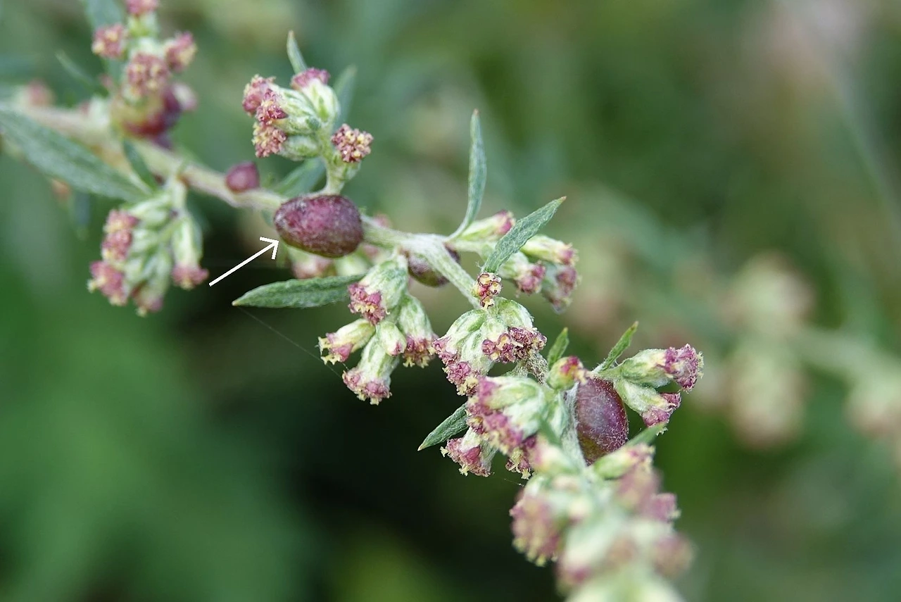쑥꽃과 국화잎혹파리 충영(화살표)