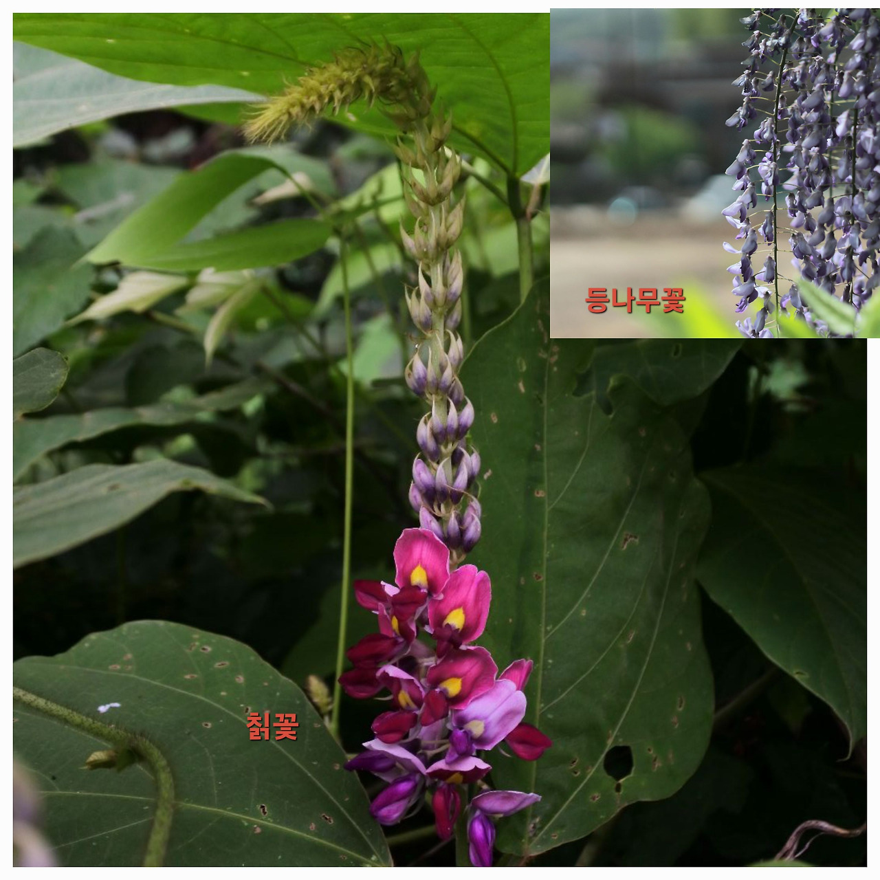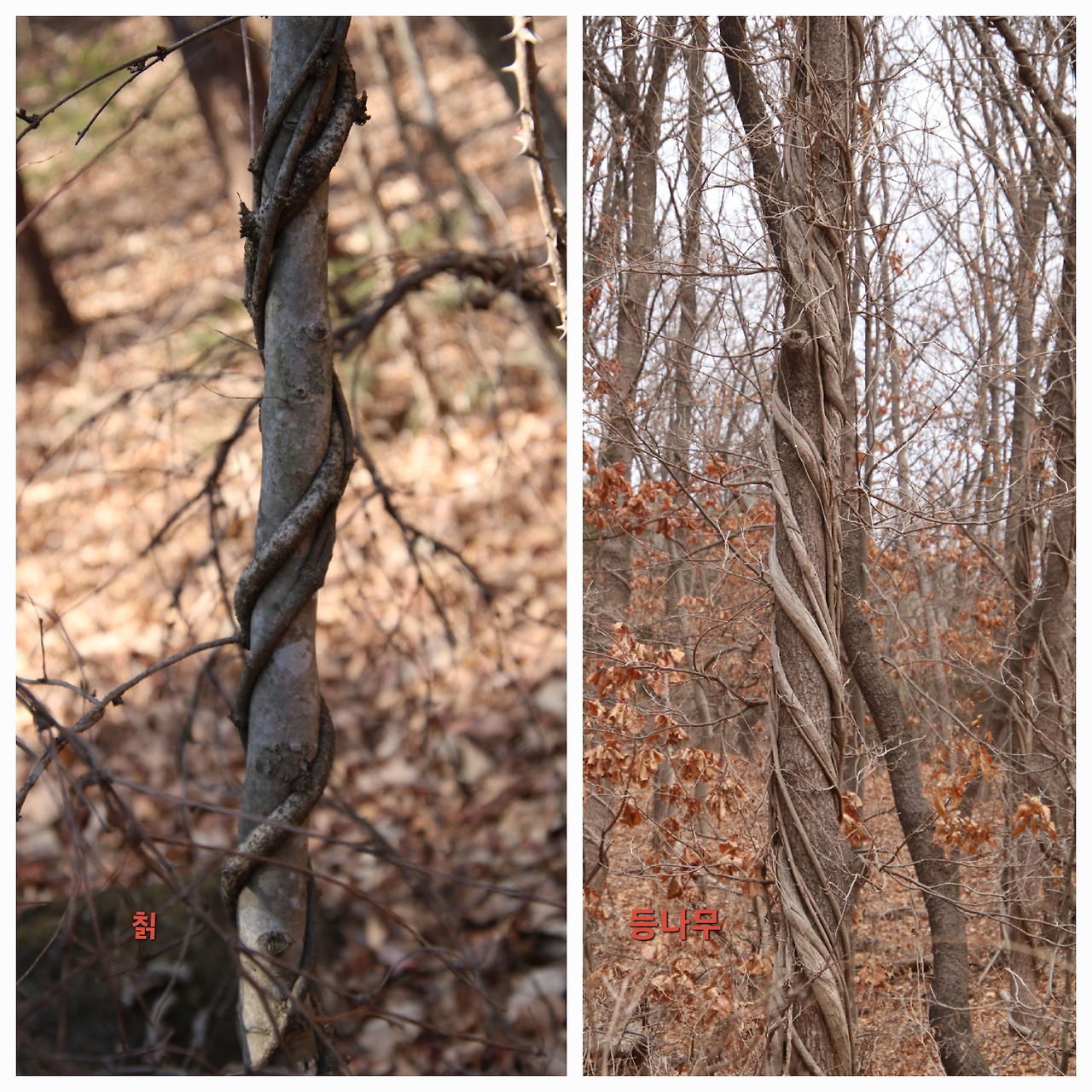 우로 감는 칡과 좌로 감는 등나무 (좌), 위로 피는 칡꽃과 아래로 피는 등나무 꽃(우)