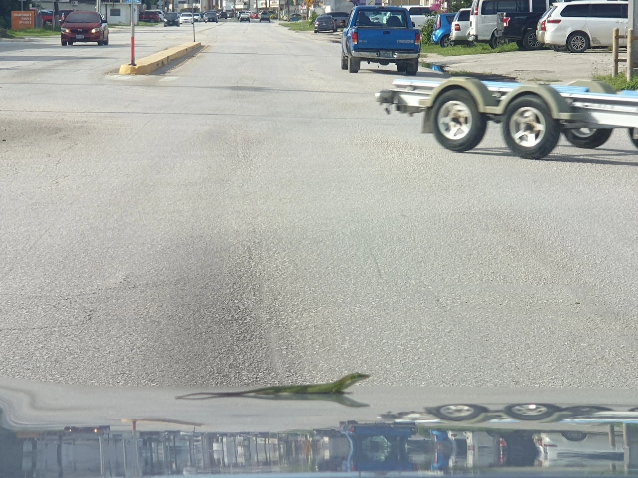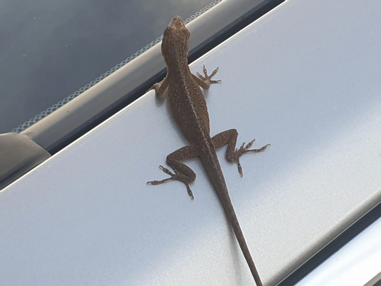차 보닛 위에 떡하니 자리 잡고 있는 게코(Gecko) 한 마리가 보인다.