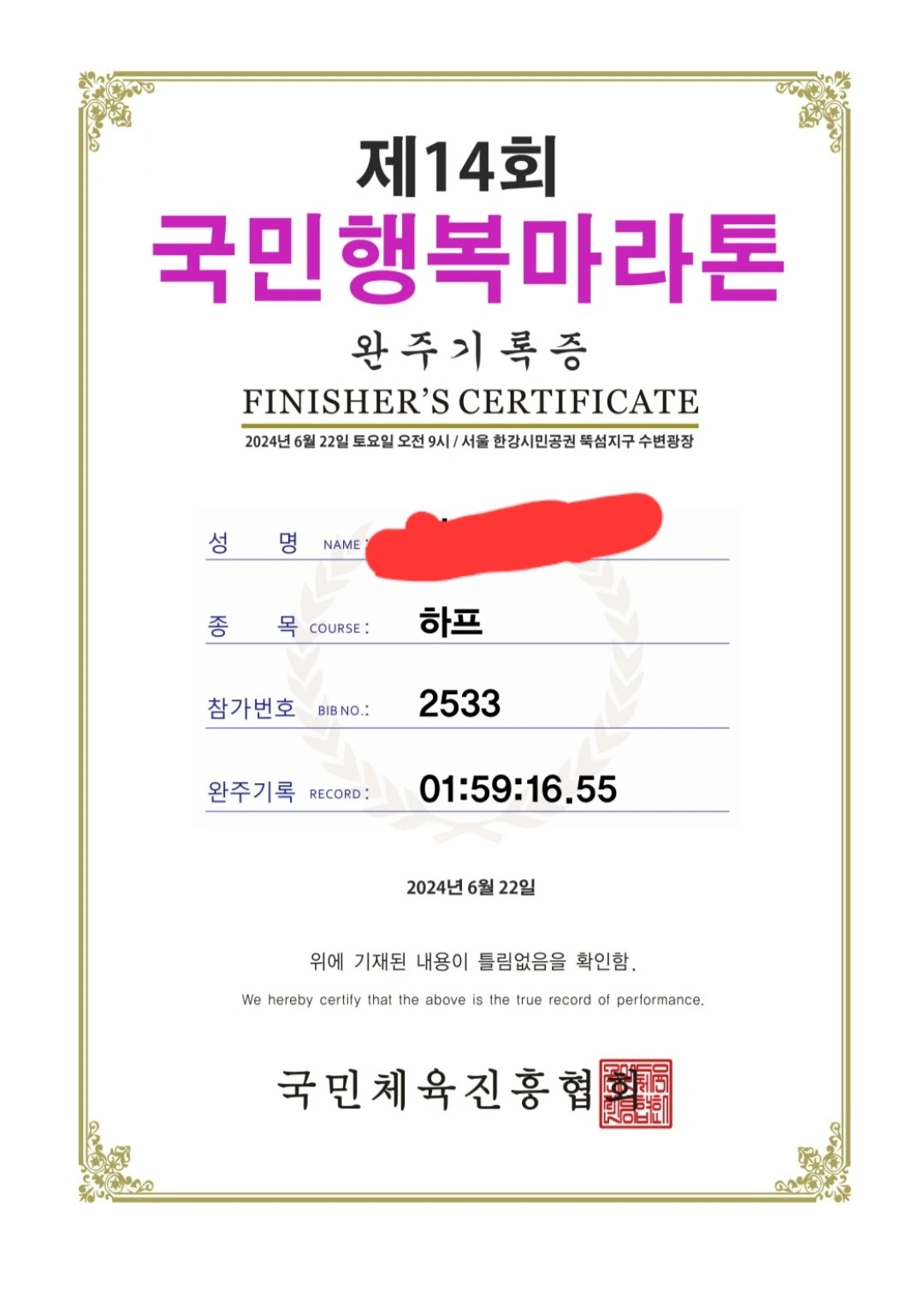모든 에너지를 소진할 만큼 최선을 다해 달리고 들어와 시간을 보니 1시간 59분 16초!
