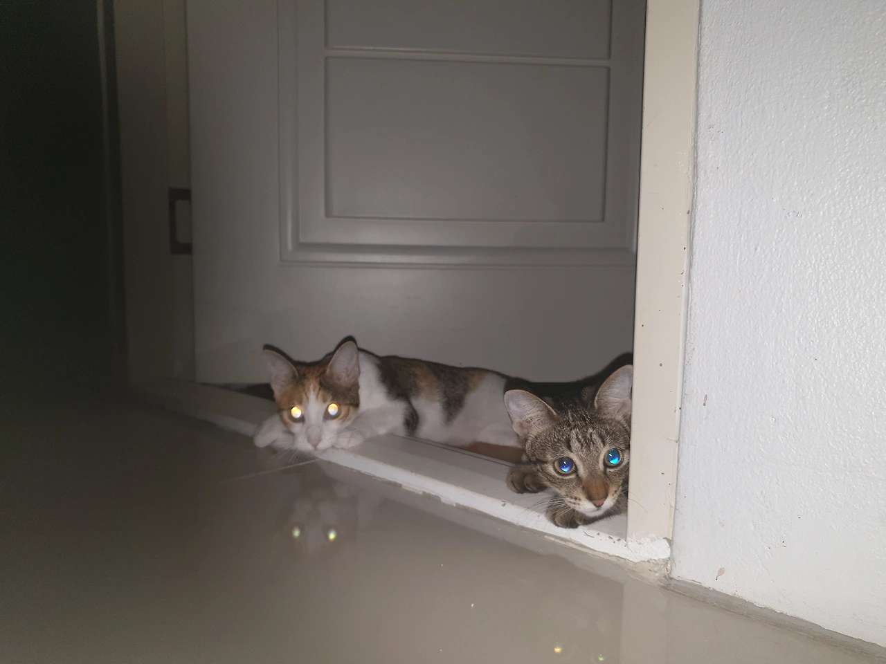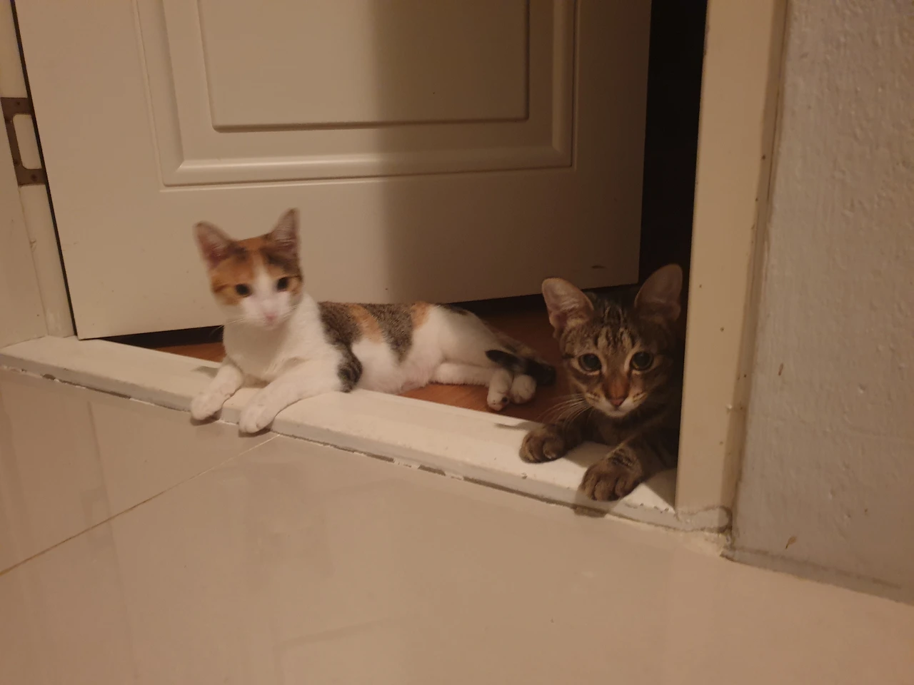 냥 자매, 체리와 베리가 엄마를 배웅한다.