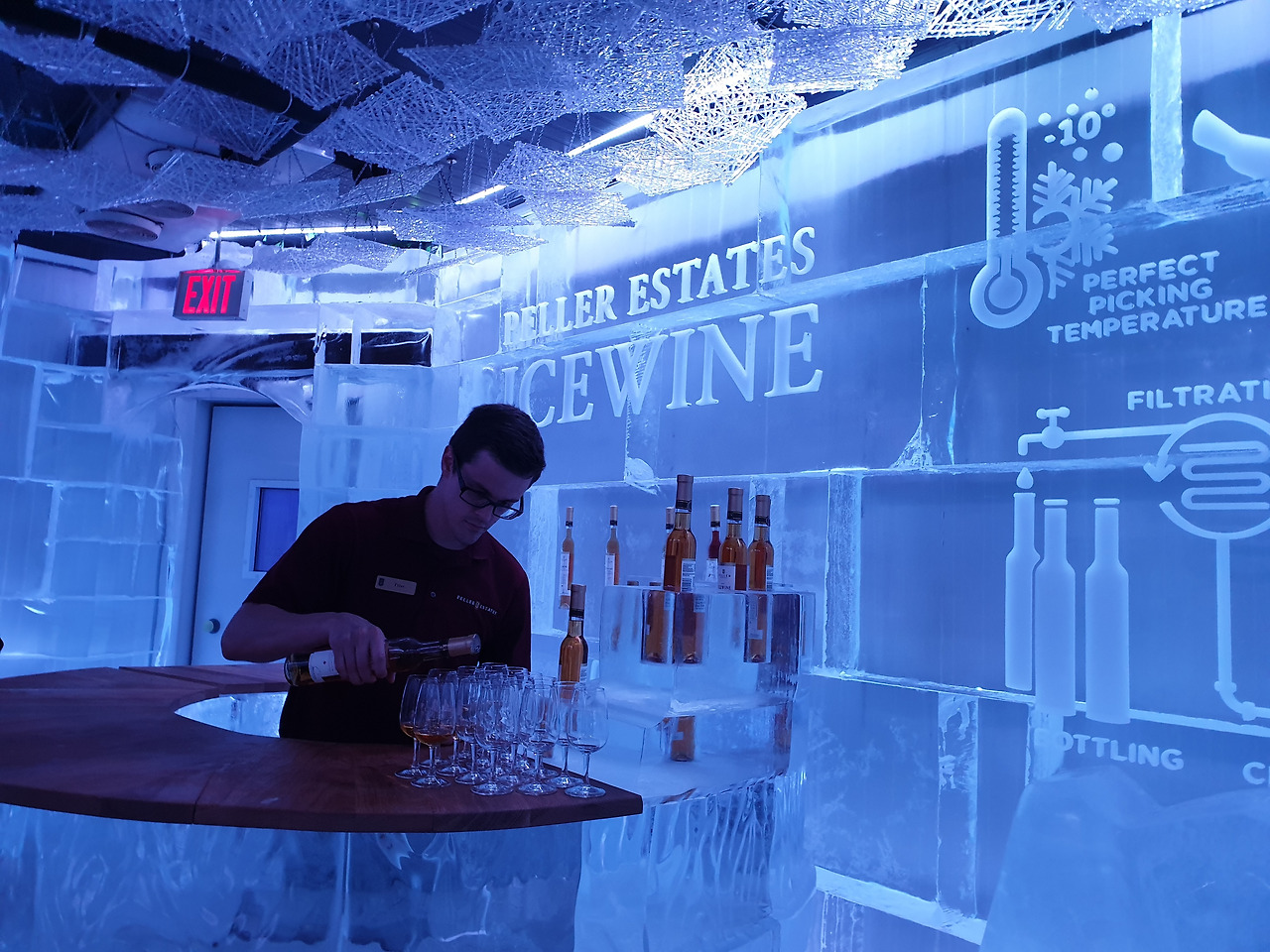 방문객들이 얼음 궁전 안에서 사진 촬영도 하고 아이스 와인을 시음하기도 하면서