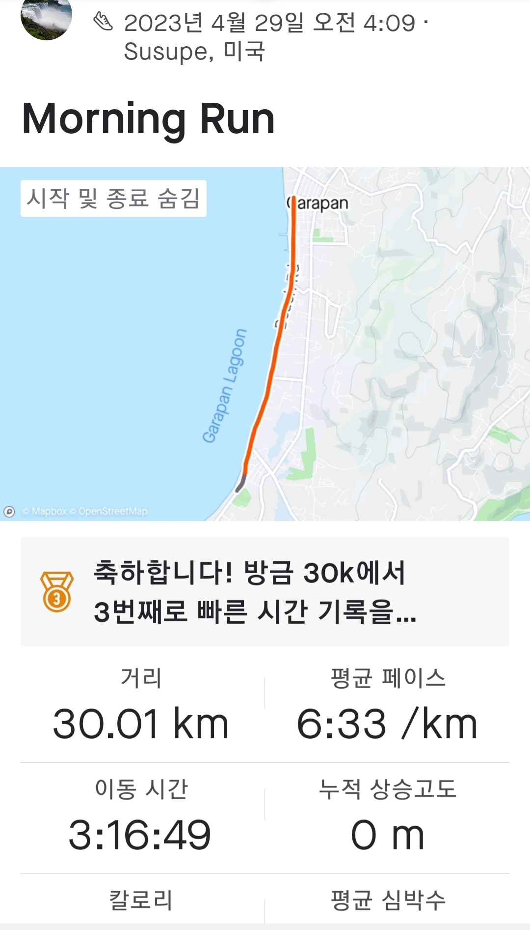 새벽 4시 9분, 드디어 30킬로 장거리 훈련 시작이다.
