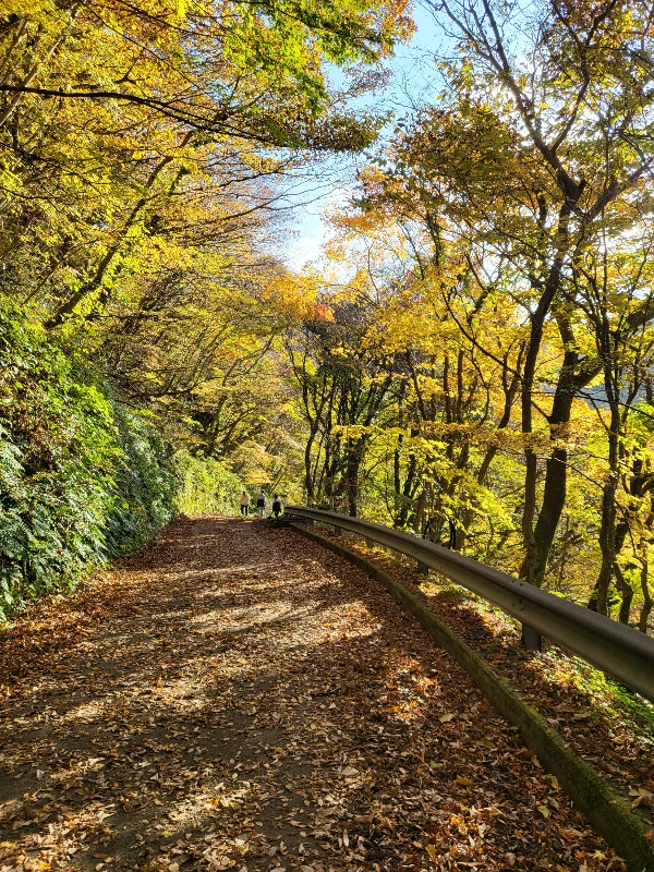 폭 2미터 남짓한 길 양옆에는 나무들이 즐비하게 서 있다. 서어나무와 단풍나무가 주종을 이루고 있다. 저마다의 빛깔로 가을을 붙잡고 있다. 오른쪽으로는 가드레일이 설치된 걸 보니 절벽이거나 계곡일 가능성으로 이어지는 듯하다. 그 너머로 천아오름 등성이 살짝 드러낸다. 왼편 언덕 나무들이 오른쪽으로 비스듬히 기울어 있다. 언덕기슭에는 고사리와 담쟁이넝쿨이 뒤엉켜 짙은 초록과 연둣빛을 뿜어낸다. 미세한 햇빛으로도 짙고 옅은 농도를 더해 입체적이다. 양쪽 나무들이 가느다란 것으로 보아 환경이 열약함을 감지할 수 있다. 가드레일 너머 나무의 그림자는 사선을 그으며 오른쪽으로 드리워진다. 오후 서너 시가 된 듯싶다. 햇살이 길 위에 볕뉘의 무늬로 명암을 새긴다. 낙엽이 덮은 길은 순간 자신의 본모습을 살짝 내비친다. 온전히 낙엽으로 수북하게 쌓여 있다면, 길은 흙길일 거라는 착각이 들만큼 내딛는 발밑이 딱딱하지 않다.