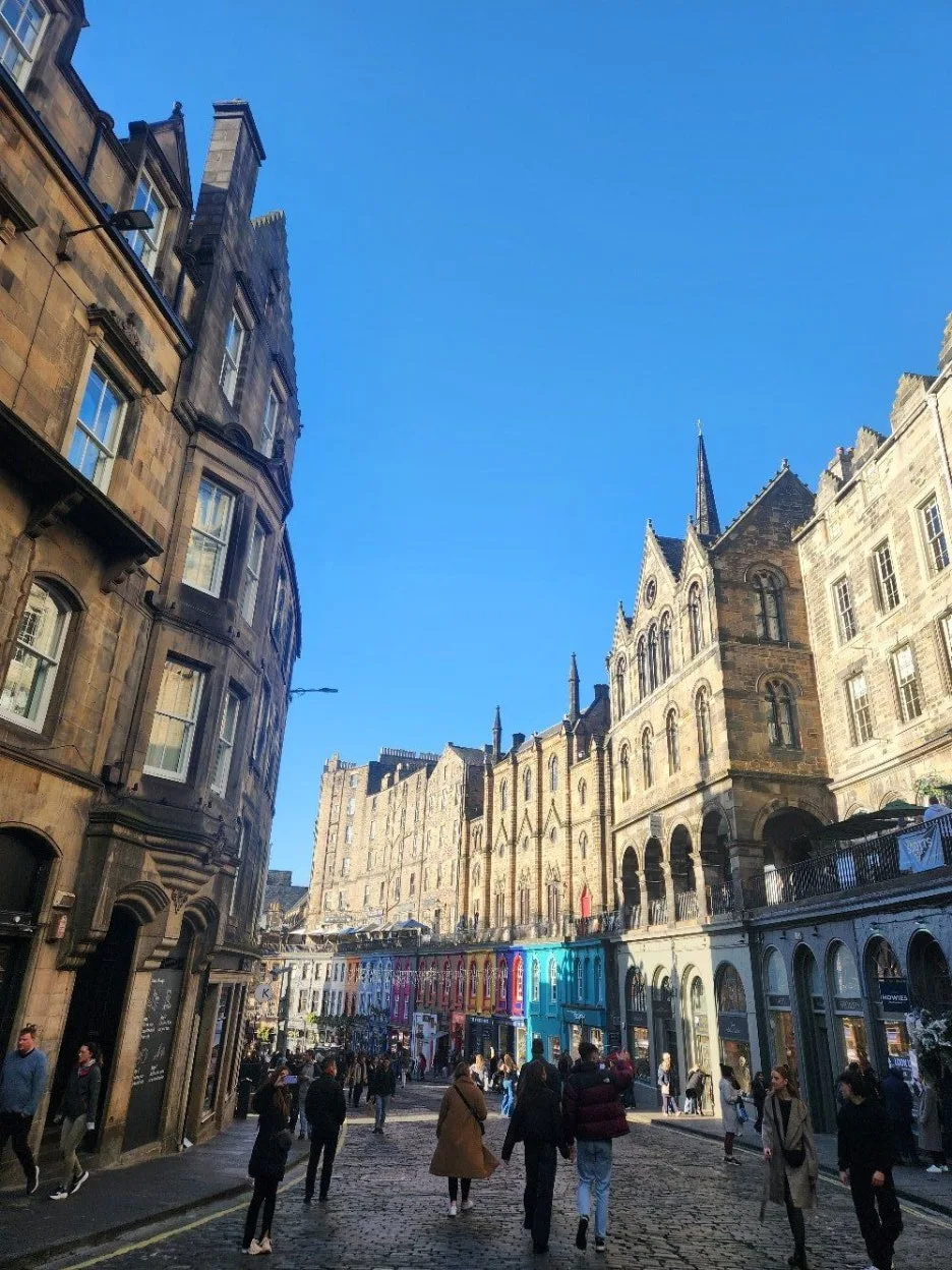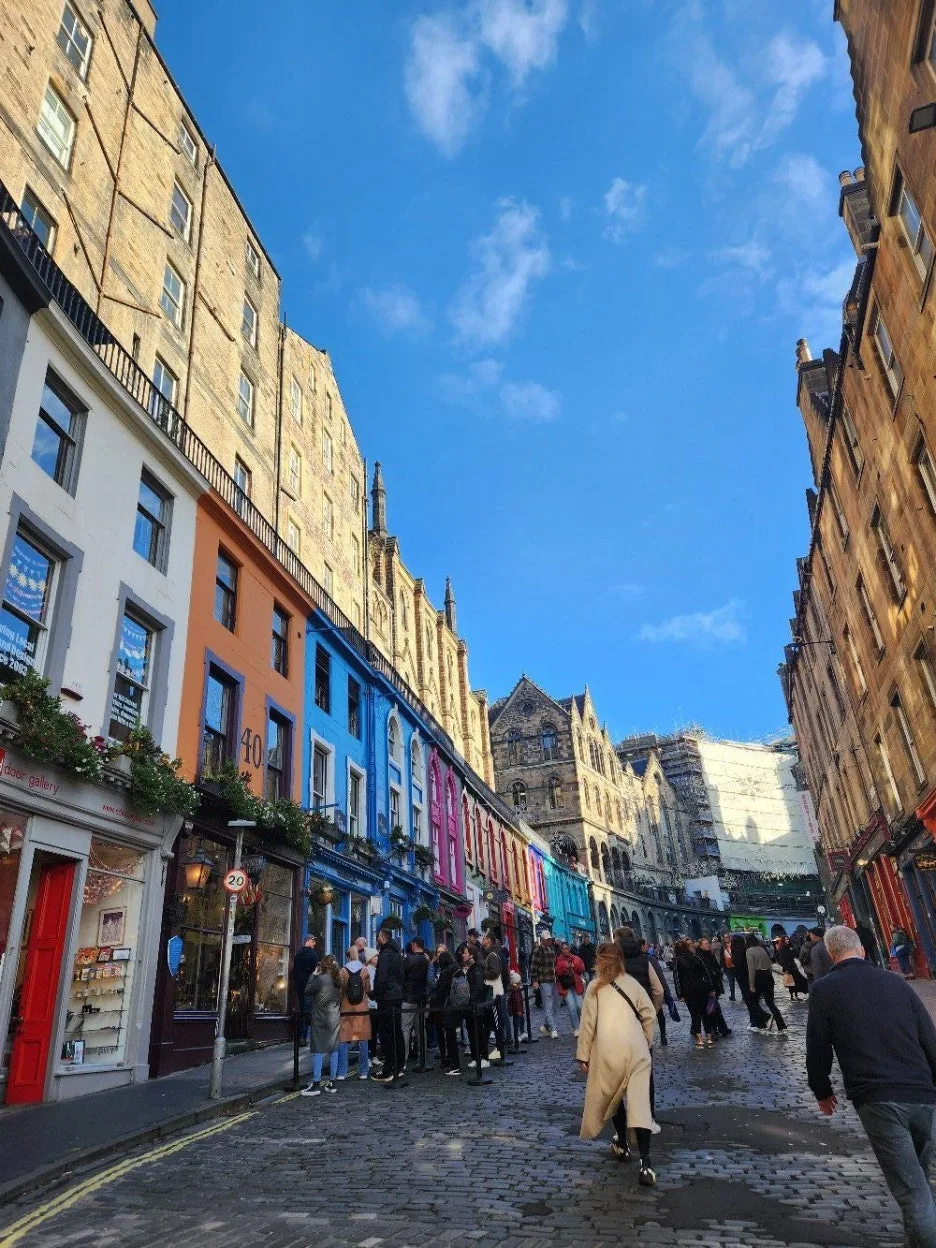 날씨가 우리의 여행 일정을 꿰뚫고 있는 것 같았다. 어제는 에든버러 성이 메인이벤트라 그에 맞게 흐릿한 날씨로 무대 세팅을 해줬다면, 오늘은 알록달록한 장소를 중심으로 돌아가는 전개인 걸 눈치챘는지 180도 다른 하늘 배경을 선보였다.