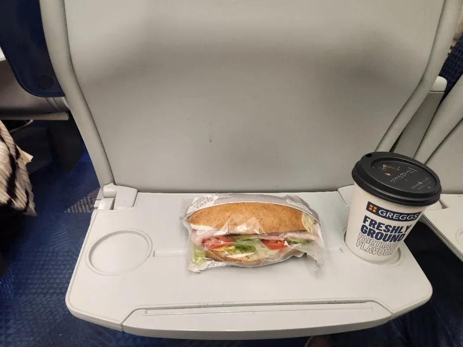기숙사가 있는 셰필드에 도착하면 밤이기에 기차를 타기 전 샌드위치를 사기로 했다. 심지어 한번 갈아타야 해서 배를 든든히 채워야 했다. 신선한 야채를 한입 가득 넣고 싶어 햄과 야채가 든 샌드위치를 골랐다. 야채의 허기짐을 채워줄 카페라테까지 완벽했다. 갈 때도 기차에서 Greggs를 갔는데 올 때도 Greggs를 가게 되었다.