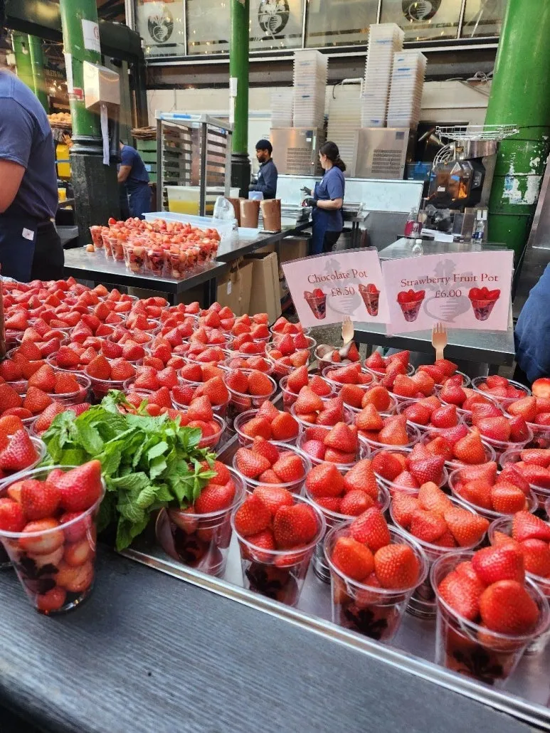 마켓에서 마지막으로 먹었던 음식은 초콜릿 딸기 퐁듀였다. SNS에서 한 번쯤 자랑하고 싶은 탐스러운 생김새였다. 이번에는 한 컵씩 사이좋게 샀다. 버로우 마켓의 대표적인 디저트라고 한다. 역시 맛없을 수 없는 달콤한 후식이었다. 마지막까지 완벽하게 즐긴 버로우 마켓. 다음에 오게 된다면 이곳에서 빵이나 식재료를 사고 싶다.