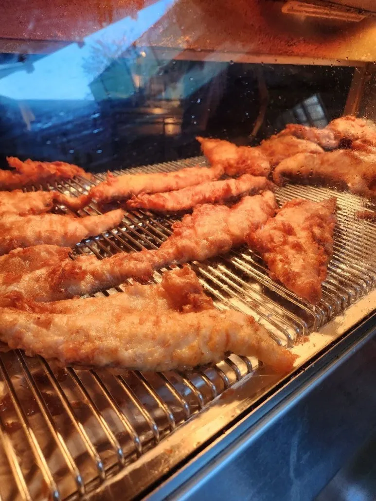 따끈따끈한 온열 조명 아래에 데워지고 있는 생선튀김들이 침을 꼴깍 삼키게 만들었다.