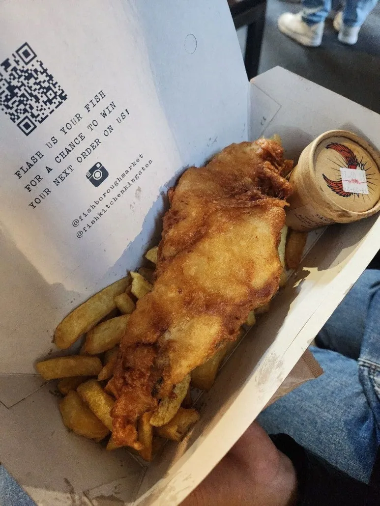 영국이 갖고 있는 유일한(?) 자부심이 깃든 음식. 피시 앤 칩스. 그중에 으뜸이라는 광고 문구가 우리들의 눈을 사로잡았다. 그렇게 뜻밖의 첫 피시 앤 칩스를 버로우 마켓에서 하게 되었다. 길게 늘어진 줄을 보며 '이건 먹어야겠다!'는 확신이 들었다.