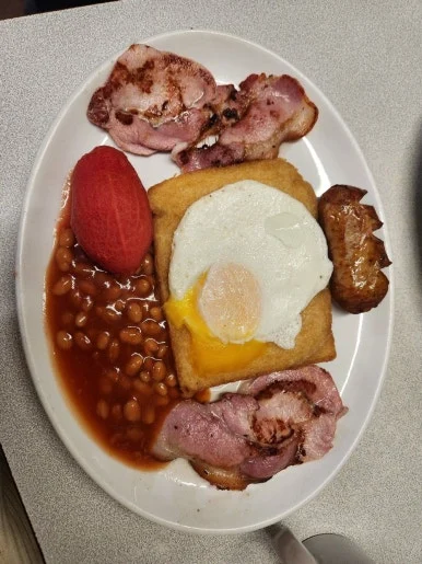 그리고 한쪽에 자리를 잡은 baked beans. 이 친구도 아까 빨간 버스처럼 구면인 친구다. 10살 때 영국 학교 급식을 먹으려고 앉았는데, 이 갈색 콩의 무리가 나에게 큰 충격을 주었다. 어린애가 봤을 때 절대 먹기 싫을 것처럼 생겼다. 하지만 보기와 다르게 맛은 상당히 내 취향이었다. Baked beans를 먹고 싶어서 급식이 기다려지는 정도였다. 한국에 와서 먹을 기회가 전혀 없었는데, 다시 맛볼 수 있어 냉큼 한 움큼 퍼먹었다. 처음 먹었을 때와 달리 추억의 맛까지 더해졌다. 베이컨은 사진에서 보이는 것보다 훨씬 컸다. 유럽 아니랄까봐, 햄과 소시지는 조금 짰지만 그래도 확실한 로컬 맛집이었다. 이곳에 산다면 주기적으로 찾아갔을 것이다. 몸과 마음이 따뜻해진 아침 식사였다.