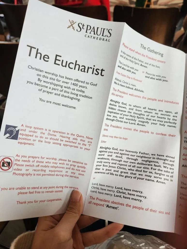 주위 사람들 눈치를 살펴 가며 일어났다가 앉기를 반복했던 것 같다. 순서표에 신부가 할 말씀들이 써져 있었지만, 그 외 추가적으로 말씀하신 게 훨씬 많고 라틴어로 읊어서 내용 자체를 알아들을 수는 없었다. 그래도 세인트폴 대성당에서 미사를 들을 수 있다는 경험 자체로 지루하지 않았다. 아, 뒤로 갈수록 '음... 이제 곧 끝나려나?' 생각은 들었다.