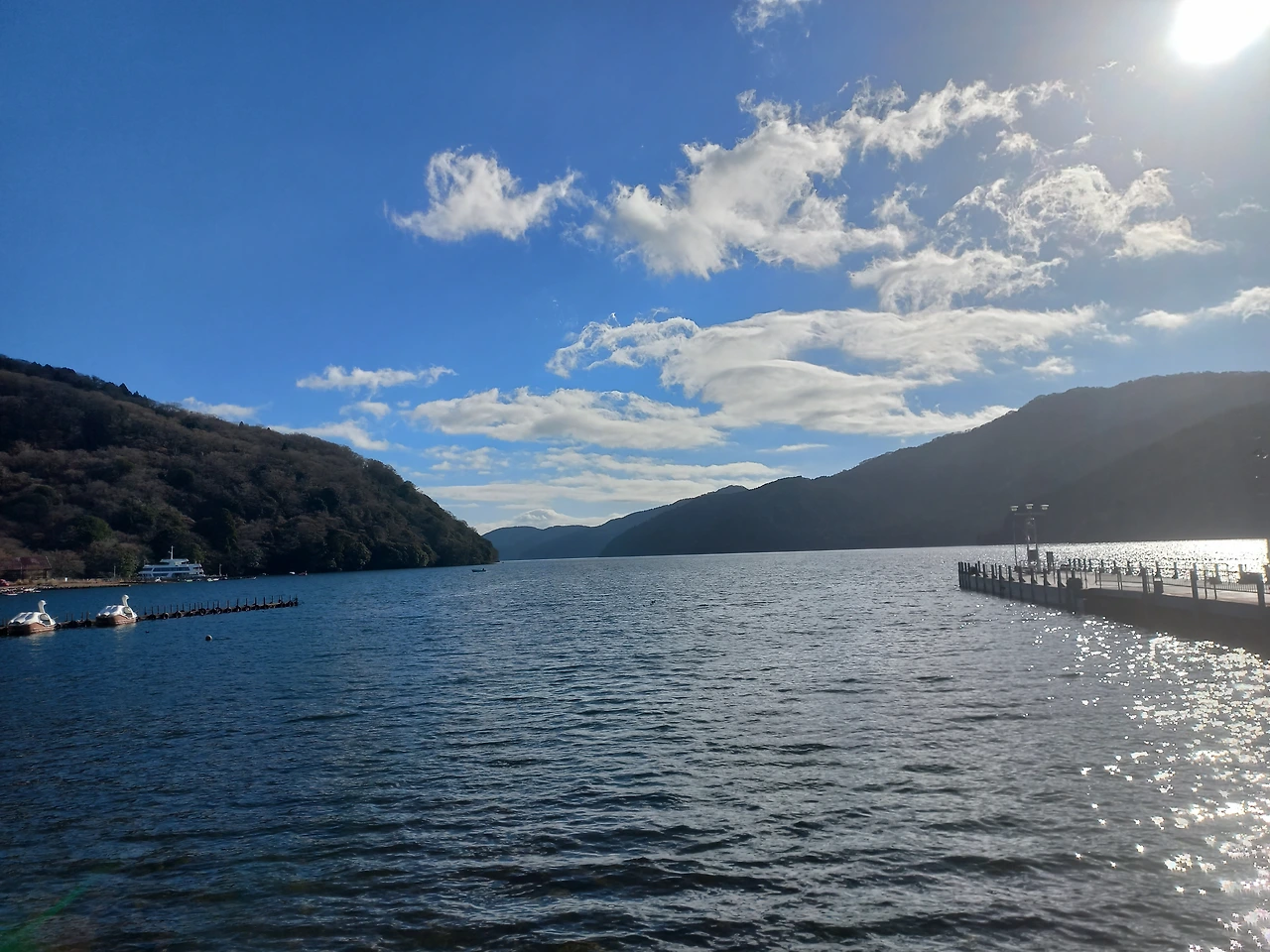 배 타는 시간이 가까워오자 해적선을 타기 위해 많은 사람들이 줄 서서 기다리고 있었다. 가이드가 눈치 빠르게 특실을 예매해서 우리는 줄 서지 않고 바로 배에 승선할 수 있었다. 사십여 분간 “아시노 호”을 천천히 돌았다. 날씨도 맑았고 잔잔한 바람과 함께 햇볕에 반짝이는 물비늘로 눈이 부셨다. 나룻배가 떠다니며 물고기를 잡는 어부들도 간간이 보이고 산봉우리 눈이 쌓인 후지 산이 멀리서 보였다. 배에서 내려 다시 "오와 쿠다이"로 케이블카를 타고 올라왔다.