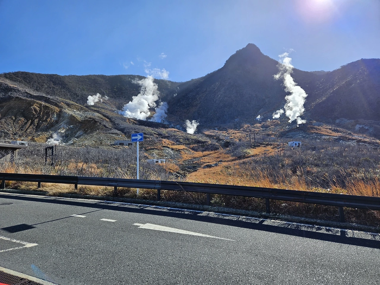 두 시간 동안 달려오자 유황 냄새가 코를 찌르고 활화산 지역인지라 산에서 불이 난 것처럼 연기가 솟아오르고 있었다. 특유의 화산 특성으로 온천물이 유황뿐만 아니라 다양한 미네랄이 함유하고 있다고 한다. 그래서 많은 관광객들이 피부 질환 개선과, 스트레스 해소를 위해 온천욕을 즐기기 위해 이곳을 찾는다고 한다. 또 유명한 것은 뜨거운 온천수에 한 시간 동안 삶아져 나온 검은 계란이다. 한 개 먹으면 칠 년이 젊어진다는 말에 꼭 사서 먹기로 하고 일단 케이블카를 타기 위해 줄을 섰다. 유황이 솟아나는 골짜기를 케이블카를 타고 내려갔다. 어제도 날씨가 좋더니 오늘도 날씨가 좋은 탓에 멀리 서 있는 후지산도 볼 수 있었다.
