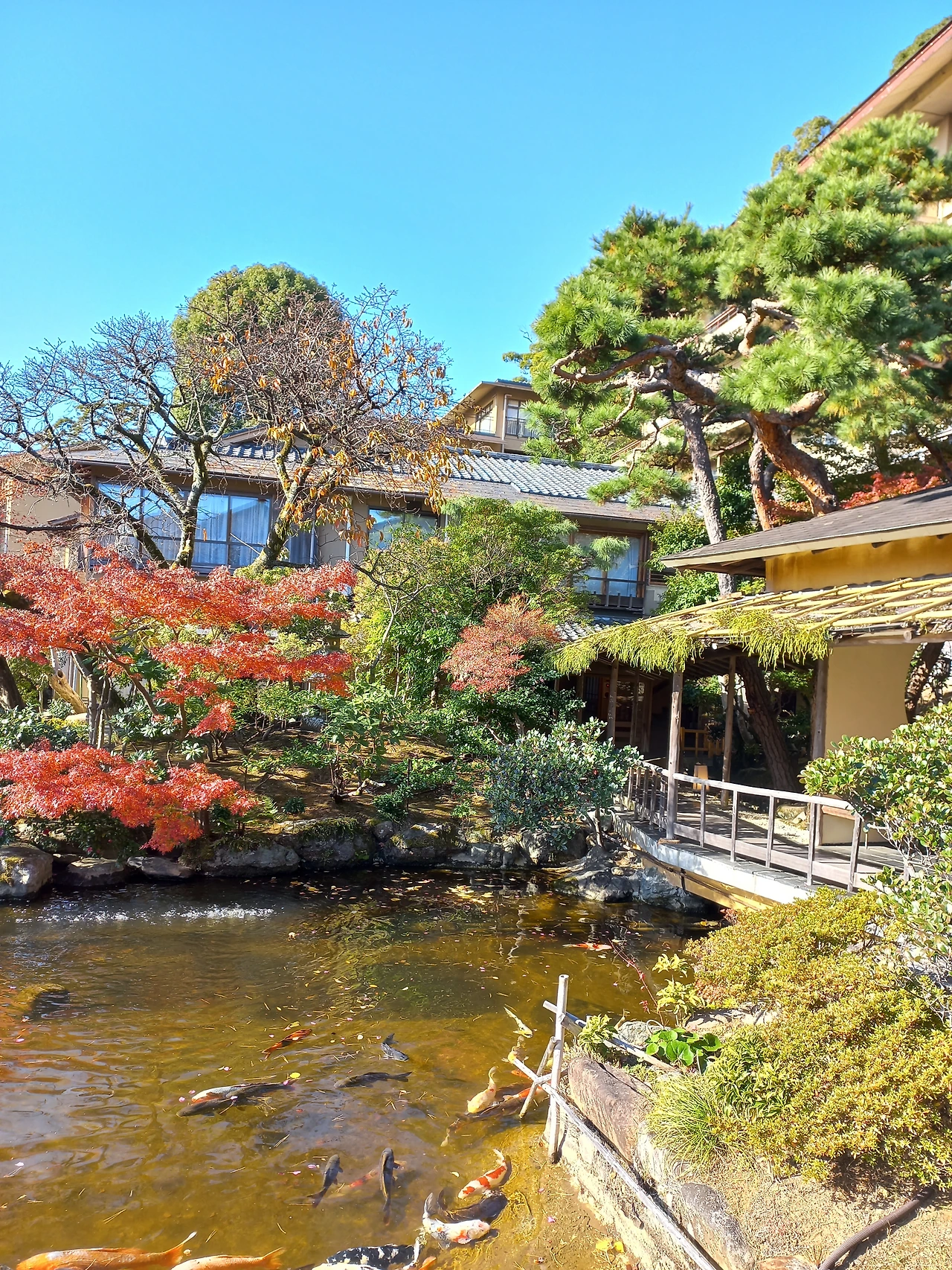 해 질 녘에 도착했던 지라 어제 정원구경 제대로 하지 못했다. 체크아웃하기 전에 호수가 있는 정원을 한 바퀴 돌았다. 앞으로는 망망한 푸른 바다가 끝없이 보이고 뒤에는 산이 병풍처럼 둘러있었다. 동백꽃이 피는 시기인지 여기 저기 연한 분홍 빛을 띠고 배시시 웃고 있었다. 올해 한국에서 제대로 보지 못한 단풍도 눈이 시리도록 구경했다. 모두들 아름다운 정원에서 각자 핸드폰을 들고 순간을 담아냈다.