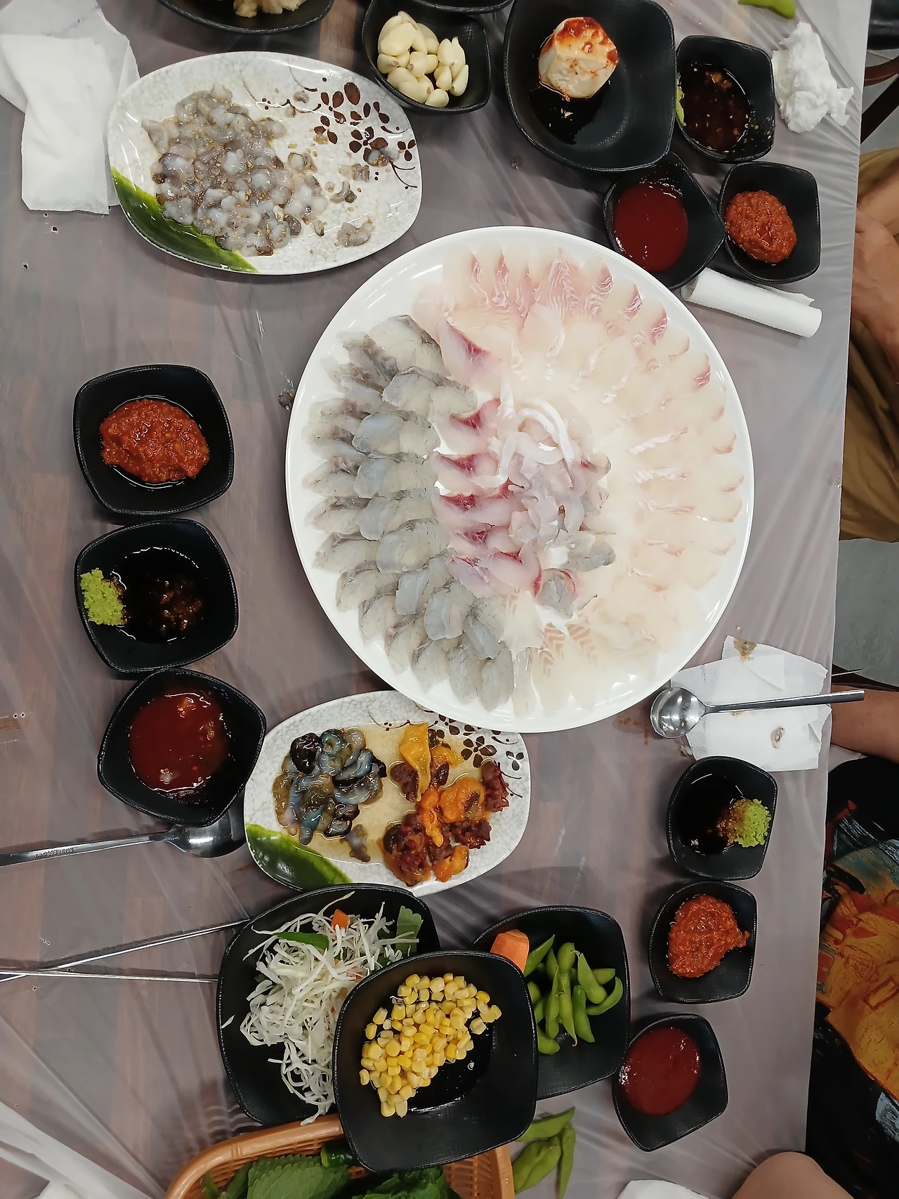 낮에는 민락동에 위치한 횟집에서 팔딱팔딱 뛰는 광어, 도다리, 낙지, 멍게, 해삼을 한 상 차려서 먹었다. 마지막에 얼큰하게 끓여 온 해물찌개로 마무리했다.