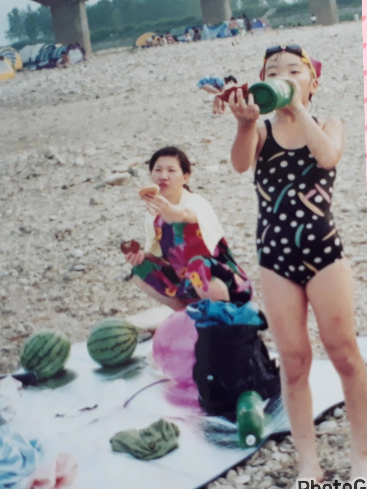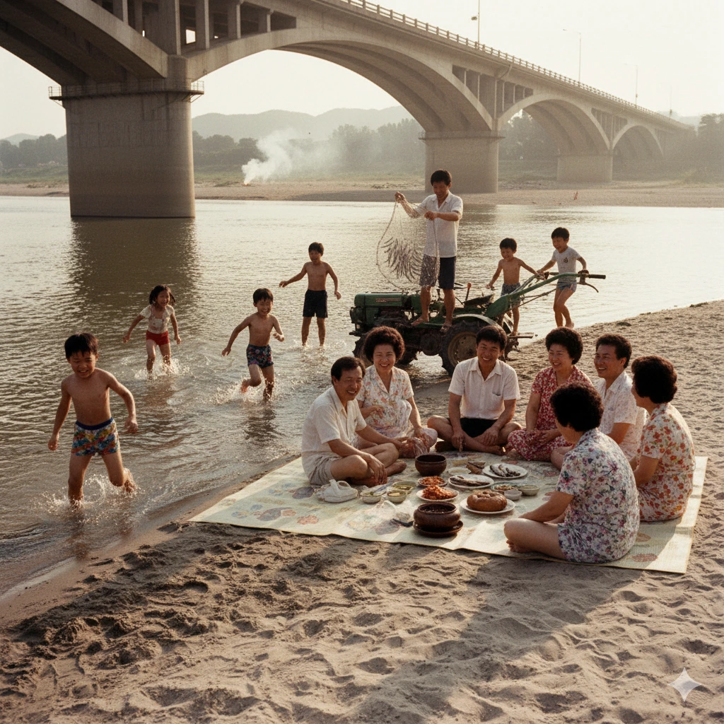 팔십 년대 후반으로 여름휴가를 맞이해서 시집형제들과 함께 아이들을 데리고 섬진강변에서 피서를 즐기던 사진이다.