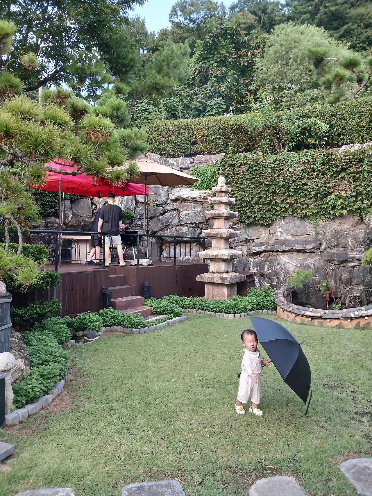 우산을 우와라고 부르며 잔디 깔린 마당을 몇 바퀴나 돌고 다닌다.