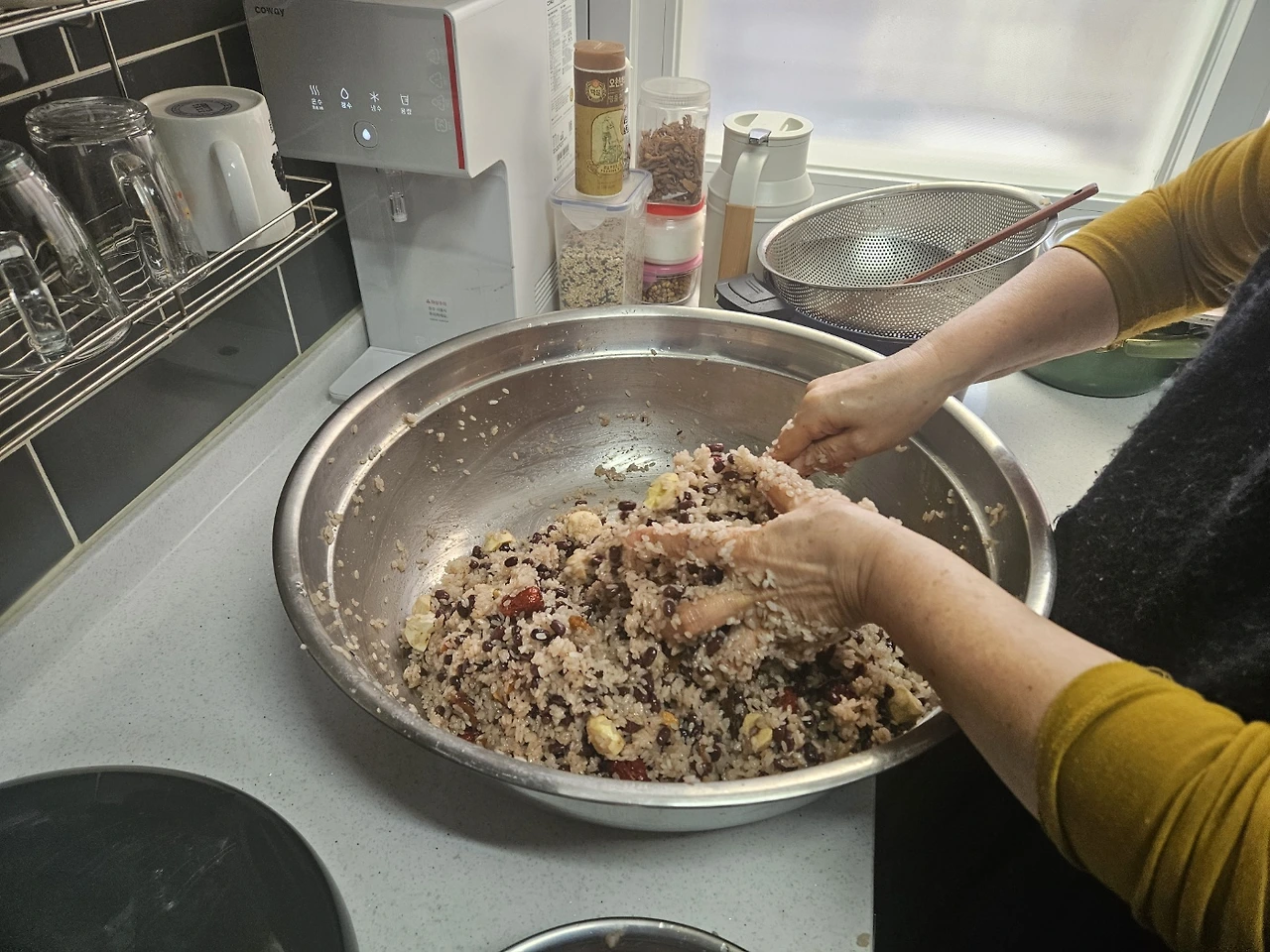 미리 간해놓은 팥물을 섞기 전 윤기가 자르르 흐르는 흰 찰밥을 보자 시장기가 돌아 한 움큼 쥐어 먹었다. 윤기 도는 찰밥에 팥물 넣고 밤, 대추, 곶감 골고루 간이 잘 베이도록 섞었다.
