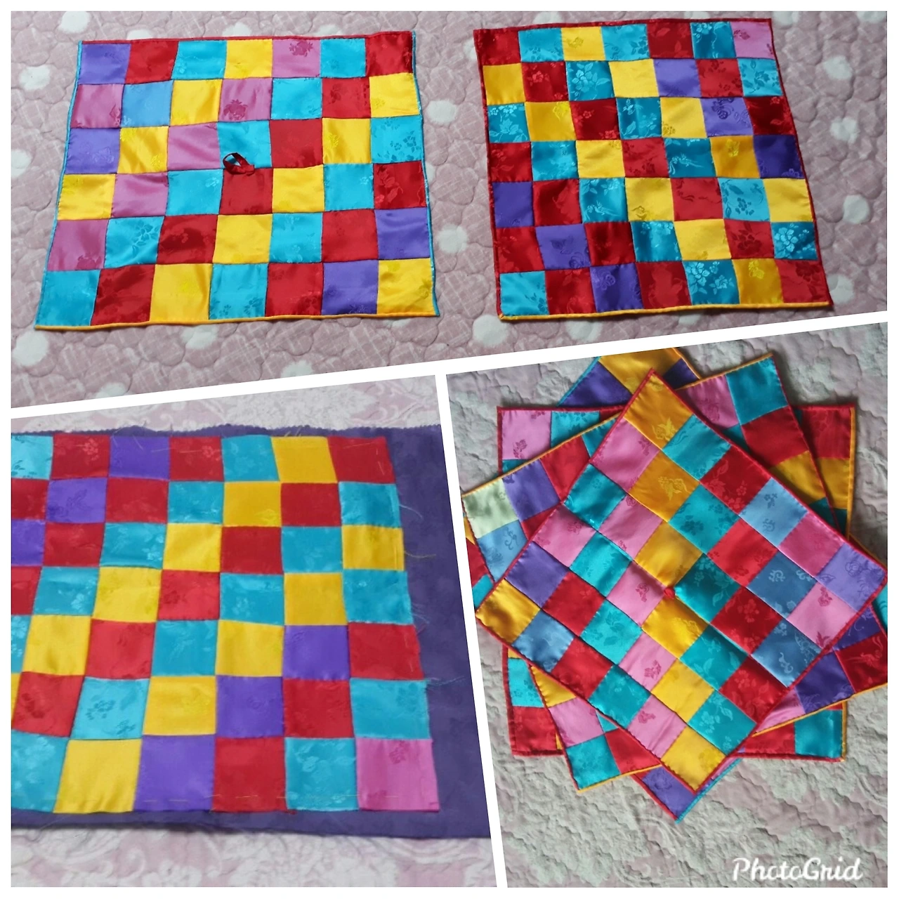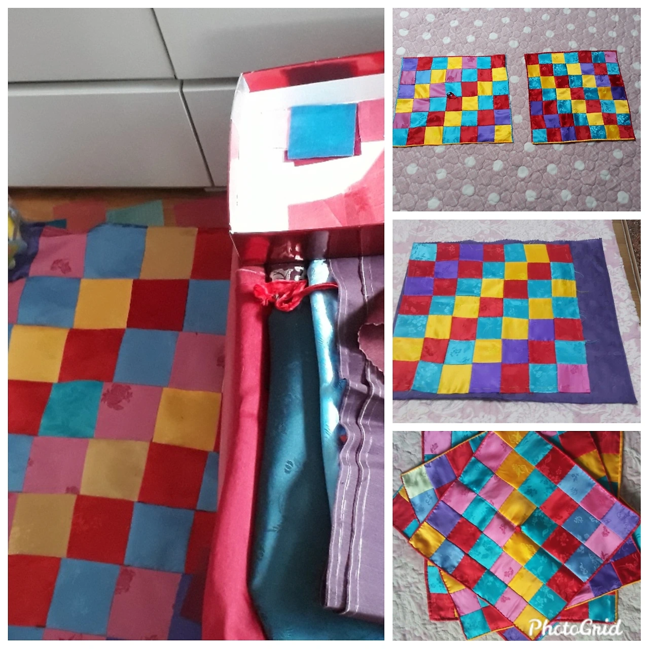 네모 반듯하게 똑같이 자르고 천이 미끄러우니 꼬맬곳을 접으시고 난 후 색상을 대각선으로 맞추시고 한 땀 한 땀 꿰매시더니 벌써 네 개째 만들어 놓으셨네요.